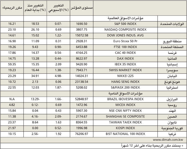وأدى إغلاق الحكومة الأميركية بعض أنشطتها إلى تأجيل نشر تقرير الوظائف الشهري الذي تصدره وزارة العمل، والذي كان مقررا في اليوم الأخير من الأسبوع الماضي. وأصبحت مهمة المسؤولين في الاحتياطي الفدرالي الأميركي في تقييم صحة الاقتصاد المحلي، وبالتالي دراسة الموعد المحتمل للبدء بتقليص برنامجه للتحفيز الاقتصادي أكثر تعقيداً وصعوبة بسبب نقص البيانات، وتراجع مؤشر United Technologies Corp. بنسبة 4.7% ليسجل أكبر تراجع من بين الشركات التي تحصل على إيراداتها من العقود الفدرالية.تبادلات جديدة وارتفعت أسهم الرعاية الصحية مع بدء باب التسجيل للتبادلات الجديدة بتكليف من قانون الرعاية، وعلى صعيد إعلان نتائج الشركات فإن كلا من Alcoa Inc وJPMorgan Chase and Co هما من بين 10 شركات من شركات SandP 500 التي من المقرر إعلان نتائجها الفصلية خلال الأسبوع المقبل.ومن المتوقع ارتفاع أرباح المؤشر بنسبة 1.7% خلال الربع الثالث، بينما يتوقع ارتفاع المبيعات بنسبة 2.2%، وفقاً لتقديرات محللين قامت وكالة بلومبرغ بجمعها. وفي واحد من الاكتتابات العامة الأكثر انتظاراً في قطاع التكنولوجيا منذ إدراج Facebook تم خلال الأسبوع الماضي نشر نشرة الاكتتاب الخاصة بشركة Twitter Inc. التي قالت انها تسعى إلى جمع مليار دولار، ووصل تقييم الشركة وفقاً لهذه النشرة إلى 12.8 مليار دولار.وتراجعت الأسهم الأوروبية للأسبوع الثاني على التوالي مع استمرار أزمة الميزانية العامة في الولايات المتحدة والمفاوضات بين الديمقراطيين والجمهوريين حول رفع سقف الدين. وانخفض مؤشر Stoxx Europe 600 خلال تداولات الأسبوع الماضي بنسبة 0.7% بعد خسارته 0.6% في الأسبوع السابق، لكن الأسهم الأوروبية حققت مكاسب بنسبة 12% منذ بداية العام مع خروج منطقة اليورو من حالة الركود ومواصلة البنوك المركزية اتخاذ إجراءات تحفيزية لدعم الاقتصاد العالمي.احتيال ضريبيوانخفض خلال تداولات هذا الأسبوع 11 مؤشراً من مؤشرات أسواق دول أوروبا الغربية البالغة 18 مؤشرا، وارتفع مؤشر فوتسي الإيطالي بنسبة 3.7%، بعدما أوصت لجنة في مجلس الشيوخ بطرد رئيس الوزراء السابق سيلفيو برلسكوني من المجلس بعد إدانته بتهمة الاحتيال الضريبي.