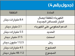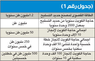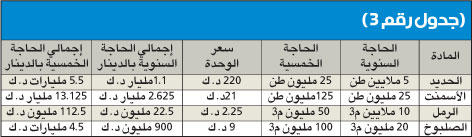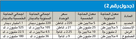 فبناء مدن لاستيعاب 150 ألف وحدة سكنية يعني بناء كويت جديدة، علماً أن مدينة الكويت والمحافظات الحالية مازالت تعاني نقصاً في بنيتها التحتية ومدارسها ومستشفياتها وغيرها من القواعد العامة التي تقوم عليها أي مدينة سكنية تجذب المواطنين للانتقال إليها.«الجريدة» تفتح ملفاً متشابكاً في العلاقة بين الأزمة الإسكانية والجهات الحكومية، ومدى إمكانية توفير الدولة للاحتياجات المستقبلية، رغم عجزها أساساً عن توفير المتطلبات الحالية.رصدت «الجريدة» أرقاما ضخمة تحتاج الى ميزانيات اعوام، لا ميزانية عام واحد، في حال فكرت الكويت بحل المشكلة الإسكانية بصورة جذرية، لا مجرد حل إسعافي.ومن خلال متابعات «الجريدة» لاعلانات الجهات والوزارات الرسمية فإن مشكلة الاسكان في الكويت لن تحل دون مساعدة القطاع الخاص، سواء من ناحية الروتين اليومي والدورة المستندية المعوقة لكل نشاط او من حيث الاموال التي تحتاج الدولة الى رصدها وضخها في السوق لحل المشكلة الاسكانية.وتعتبر الكويت بلدا مستوردا للمواد الاولية التي تحتاجها لصناعة حديد التسليح، وهي بحاجة الى نحو مليون طن سنويا من المادة المنتجة من حديد التسليح الجاهزة للاستخدام في اعمال البناء والانشاء.يذكر ان سعر الطن في الوقت الراهن يصل الى نحو 220 دينارا وهو قابل للانخفاض والارتفاع بشكل طفيف في ظل عدم وجود مشاريع عملاقة على مستوى العالم او المستوى المحلي.وهذا يعني ان حاجة السوق المحلي من مادة حديد التسليح تقدر بنحو 220 مليون دينار كويتي سنويا، وهذا التقدير يعتمد على ما هو قائم على ارض الواقع والذي يقدر بنحو 2000 وحدة سكنية، وليس 10 آلاف وحدة، كما تخطط الدولة او 105 آلاف وحدة وفق آخر احصاءات مؤسسة الرعاية السكنية لطلبات الاسكان.ومن جهة اخرى، ذكرت وزارة التجارة والصناعة انها لم تتلق بعد اي طلب لتأسيس شركة المطلاع او شركة الخيران، اللتين نصت خطة التنمية على تأسيسهما للاشراف على بناء الوحدات السكنية الجديدة.وبعملية حسابية بسيطة نعلم أن الكويت تحتاج الى 5 ملايين طن من الحديد سنويا اذا ارادت انجاز 10 آلاف وحدة سنويا، اي ما قيمته 1.1 مليار دينار (3.85 مليارات دولار).واذا تابعنا العملية ببساطة نجد ان الخطة الخمسية الواحدة تحتاج من الحكومة رصد ما قيمته 5.5 مليارات دينار (19.25 مليار دولار)، تنجز الدولة خلالها 50 الف وحدة سكنية من اصل 105 آلاف طلب، مع تجاهل الزيادة في اعداد الطلبات المقدرة بنحو 8 آلاف طلب سنويا.الجدول رقم (1) يبين الطاقة القصوى لمصنع الحديد الوحيد في الكويت وحاجة الكويت الاعتيادية، يضاف الى هذا ان هناك شركات استيراد حديد تسليح تعمل في السوق وكلها غير قادرة على تأمين المادة حسب ما يقدر لها في بيانات الحكومة.من الجدول رقم (1) يتبين لنا ان مصنع الحديد الوحيد في الكويت لن يستطيع سد حاجة السوق المحلي في حال انطلقت المشاريع الاسكانية، الى جانب شركات الاستيراد لان الحاجة ستكون اكبر من المقدر لها في دفاتر الحكومة وسجلاتها.معضلة الأسمنتتعتبر الكويت دولة غير منتجة للأسمنت بمعنى ان المصانع فيها اما تركيبية او تجميعية لمادة الاسمنت المستوردة في الاصل، ويضاف الى هذا الشركات المستوردة للاسمنت المعبأ الجاهز للتوزيع داخل السوق المحلي.وتقدر حاجة الكويت من مادة الاسمنت بنحو 5 ملايين طن سنويا، فيما يقدر السعر المعتاد للأسمنت كمتوسط حسابي دون التفريق بين أسمنت مقاوم، واسمنت عادي بنحو 21 دينار كويتي (73.5 دولارا) للطن الواحد.وبناء على هذه فانه يتطلب لانجاز 2000 وحدة سنويا 50 مليون طن سنويا من مادة الاسمنت مع بعض الاشغال الاخرى المرادفة لعمليات الانجاز، اي ان المبلغ الذي سوف يستهلكه تأمين مادة الاسمنت فقط سيصل الى نحو 1.05 مليار دينار (3.675 مليارات دولار) سنويا، اي ان الحاجة ستصل الى نحو 5.25 مليارات دينار كويتي (18.37 مليار دولار) خلال خطة السنوات الخمس لانجاز 50 الف وحدة سكنية فقط، وليس 105 آلاف طلب اسكاني.الصلبوخ مستوردتستهلك الكويت سنويا حوالي 4 ملايين متر مكعب من مادة الصلبوخ، بمت