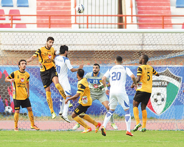 توج الفريق الأول لكرة القدم بنادي الكويت ببطولة الدوري الممتاز للموسم الرياضي 2012-2013 محرزاً اللقب الـ 11 في تاريخه إثر فوزه في الجولة الـ 18 على كاظمة بهدف من دون رد، لتصبح الجولات الثلاث المتبقية من عمر البطولة مجرد تحصيل حاصل.استعاد الفريق الأول لكرة القدم بنادي الكويت لقب بطولة الدوري الممتاز الغائب عن خزائنه منذ أربعة مواسم، ليحرز البطولة الحادية عشرة في تاريخه، وذلك أثر تغلبه على كاظمة بهدف مقابل لا شيء ضمن منافسات الجولة الـ 18 للبطولة ويرفع رصيده إلى 46 نقطة بفارق 12 نقطة عن القادسية الذي تعادل مع الجهراء الذي رفع رصيده إلى 18 نقطة في المركز الخامس، فيما تجمد رصيد كاظمة عند 15 نقطة في المركز السابع ليزداد موقفه تأزماً، كما تعادل النصر مع السالمية، ليرتفع رصيد العنابي إلى 21 في المركز الرابع، مقابل 16 نقطة للسماوي في المركز السادس.الكويت وكاظمةعلى استاد محمد الحمد دخل الأبيض اللقاء ضاغطا بقوة منذ البداية، وذلك لتحقيق نتيجة ايجابية تعلنه بطلا للمسابقة بعد تعثر القادسية في المباراة التي اقيمت مبكراً عصراً. وكان كاظمة ندا قويا للابيض بسبب اهمية اللقاء له بعد اقترابه من منطقة الهبوط حيث سعى هو كذلك الى الخروج بنتيجة ايجابية، وحافظ على ترابط صفوفه امام الضغط القوي من جانب الابيض.وقبل نهاية الشوط بدقيقة استطاع الأبيض احراز اول اهدافه من اول فرصة خطرة له امام المرمى بعد هجمة منظمة قطع بها التونسي عصام جمعة الكرة من أمام لاعبي كاظمة ولعبها ذكية إلى مواطنه شادي الهمامي على الطرف الأيمن ليعيدها الأخير عرضية جميلة إلى جمعة الذي وضعها برأسه لتصدم بمدافع كاظمة أحمد دويدار قبل أن تأخذ طريقها إلى الزاوية اليمنى لمرمى كاظمة لينتهي الشوط بهدف دون رد.وفي الشوط الثاني حاول كاظمة الرجوع في النتيجة فيما سعى الأبيض إلى التعزيز إلا أن الحال استمرت كما هي لا سيما مع اقتراب الشوط من نهايته واقتراب اعلان الابيض بطلا للمسابقة وبدأ لاعبوه استعراض المهارات وسط محاولات يائسة من جانب كاظمة، لينتهي اللقاء بفوز الابيض بهدف نظيف ويحسم اللقب قبل نهاية المسابقة بثلاث مراحل.القادسية والجهراءوفي المباراة الثانية التي جمعت القادسية والجهراء على استاد على صباح السالم بنادي النصر نجح الجهراء في خطف نقطة ثمينة من القادسية بعد مباراة مملة في شوطها الأول، ومثيرة في شوطها الثاني، الذي شهد تقدم القادسية في الدقيقة 60 عن طريق صالح الشيخ، الذي استثمر كرة داخل منطقة الجزاء وسددها مباشرة لتخدع حارس الجهراء بندر سليمان بعد اصطدامها بأحد مدافعي الجهراء، وبعد أقل من دقيقتين وفي غفلة من دفاعات القادسية عادل المحترف البرازيلي ايفاندور النتيجة، ليضع البديل سيف الحشان الأصفر في المقدمة مرة أخرى في الدقيقة 69، وقبل أن يطلق حكم المباراة علي محمود صافرة النهاية خطف نجم المباراة ايفاندرو هدف التعادل لتنتهي المباراة بالتعادل الإيجابي بهدفين لكل منهما.السالمية والنصروعلى استاد صباح السالم بالنادي العربي، أعلن المحترف البرازيلي ألمير تقدم السالمية بهدف مبكر، جاء في الدقيقة الأولى من زمن الشوط الأول، برأسية متقنة من كرة عرضية لخالد عجب فشل الحارس محمد الصلال في التصدي لها، ورغم هيمنة السماوي على مجريات الأمور، إلا أن فيصل العدواني نجح في إدراك هدف التعادل للنصر في الدقيقة 31 من تسديدة قوية سكنت شباك الحارس محمد هادي، لكن خالد عجب كان له رأي آخر، حيث نجح في إحراز الهدف الثاني للسماوي بعد هدف العدواني بدقيقة واحدة، بعد أن وضع الكرة "لوب" على يمين الحارس لينتهي الشوط الأول بتقدم السماوي بهدفين مقابل هدف وحيد.وفي الشوط الثاني تراجع السالمية بشكل واضح للخلف، ما أتاح الفرصة للاعبي النصر للهجوم، وكان في مقدور البديل السوري محمد زينو إهداء السالمية نقاط اللقاء الثلاث من خلال الفرصتين اللتين أتيحتا له عقب نزوله مباشرة، لكنه أهدرهما بغرابة شديدة، وفي الوقت الذي كان يستعد فيه حكم اللقاء مسعد العسعوسي لإطلاق صاف