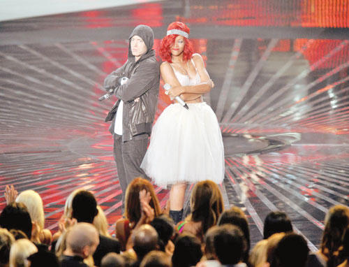 تحيي مغنية الـ«آر إن بي» ريهانا سلسلة من الحفلات الموسيقية في الولايات المتحدة هذا الصيف مع مغني الراب إمينيم بعنوان «جولة الوحش»، بحسب ما كشفت مجموعة «لايف نايشن» القيمة على هذا الحدث.وتنطلق هذه الجولة المشتركة تحت عنوان «مانستر تور» (جولة الوحش) من لوس أنجلس في السابع من أغسطس. ثم سيقام حفل في نيويورك في السادس عشر من الشهر ذاته قبل اختتامها في ديترويت في الثاني والعشرين من أغسطس.