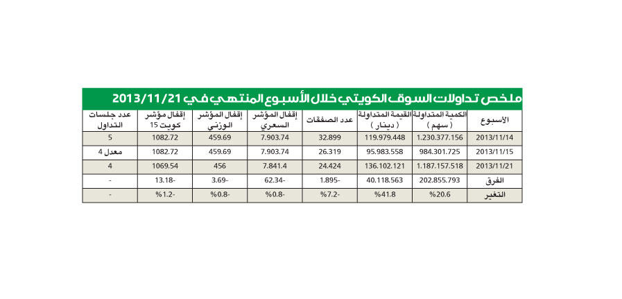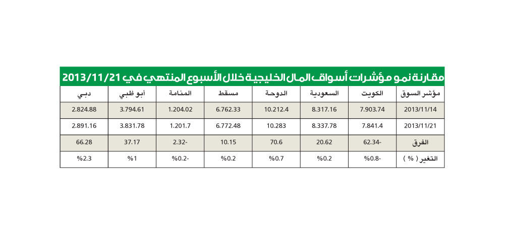 الإمارات... في المقدمةقبل اقفال مؤشر داو جونز فوق مستوى 16 ألف نقطة لاول مرة في تاريخه في جلسة الخميس الماضي استطاع سوقا الامارات "دبي وابوظبي" من استعادة اتجاههما الصاعد بقوة حيث استعاد دبي خسائر الاسبوع السابق تقريبا بعد أن ربح 2.3 في المئة تعادل 66.28 نقطة ليقفل عند مستوى 2891.16 نقطة وليستمر في اعطاء اشارات ايجابية لمستثمريه من محليين واجانب مستفيدا من تقديرات نمو جيد بحوالى 4 في المئة للاقتصاد الكلي للامارة الخليجية الاشهر والتي تعتبر بمثابة مركز للاعمال في منطقة متوسطة من العالم.وعلى ذات النسق الهادئ والمحدود التذبذب استعاد ابوظبي نسبة 1 في المئة وانهى مرحلة تصحيح وجني ارباح محدود تمت عليه في منتصف هذا الشهر ليبلغ مستوى 3831.78 نقطة ليؤكد أنه مازال مرافقا لمؤشر دبي في تصدر المؤشرات الخليجية في المكاسب لهذا العالم حيث بلغت حوالي 74 في المئة في دبي و44 في المئة في ابوظبي منذ بداية العام والتي تصنف من افضل المؤشرات العالمية نموا.قطر... أخضررغم تراجعات السوق القطري في نهاية الاسبوع والتي افقدت مؤشره اكثر من 1.5 في المئة الا ان مؤشر الدوحة استطاع الاقفال على مكاسب اسبوعية بعد سلسلة طويلة من الارتفاعات بلغت به مستوى 10400 نقطة عاد بعدها واقفل عند مستوى 10283 نقطة مضيفا 70 نقطة خضراء خلال هذا الاسبوع تعادل نسبة 0.7 في المئة تقريبا، ودائما ما يدفع نمو الدولة الخليجية الصغيرة سياسة انفاق حكومي استثماري محلي اضافة الى محاولات جادة ومستثمرة في تنوع الاستثمار الخارجي نتيجة فوائض مالية طائلة مدعومة بارتفاع اسعار الطاقة والتي تشكل الرافد الاكبر في الاقتصاد القطري. السعودية ومسقطواصل مؤشرا سوقي السعودية ومسقط مكاسبهما للاسبوع الثالث على التوالي ولكن بوتيرة أقل من المكاسب حيث لم تجاوز هذا الاسبوع عشري نقطة مئوية وذلك بعد انتهى تأثير نتائج اعمال الشركات المدرجة للربع الثالث في السوق السعودي وبقي السوق مدعوما بمكاسب مؤشرات الاسواق العالمية كداو جونز والذي تحدثنا عنه آنفا حيث أقفل عند اعلى مستوياته على الاطلاق يوم الخميس الماضي بعد انتهاء الجلسة الاخيرة من تداولات السوق السعودي الذي حصد 20.62 نقطة ليقفل عند مستوى 8337.78 نقطة.وربح مؤشر سوق مسقط كذلك عشري نقطة مئوية ليقفل عند مستوى 6772.48 نقطة مضيفا 10.15 نقاط لتتراجع قوة اندفاعه بعد مكاسب متوسطة نسبيا مقارنة مع اسواق الامارات والسعودية ولكنه بقي افضل اداء من سوقي الكويت والبحرين الخاسرين رغم التفاوت الكبير في سيولة الاسواق الثلاثة ونشاطها.خسائر القيادية في الكويتيمنيت الأسهم القيادية في سوق الكويت للأوراق المالية بخسائر واضحة تجلت في مؤشرات السوق الوزنية خاصة مؤشر كويت 15 حيث اقفل على خسارة اسبوعية بنسبة 1.2 في المئة اي حوالي 13.18 نقطة ليقفل عند مستوى 1069.54 نقطة بينما تراجع مؤشر السوق الرئيسي "السعري" بنسبة 0.8 في المئة فاقدا 62.34 نقطة ليعود الى مستوى 7841.4 نقطة وكذلك كانت نسبة خسارة المؤشر الوزني والذي اقفل عند مستوى 456 نقطة حاذفا 3.69 نقاط.وبدعم من تداولات استثنائية على سهم مشاريع ارتفعت معدلات حركة التداول قياسا بمستويات الاسبوع السابق الذي كان اكثر بجلسة واحدة بعد تعطيل جلسة الثلاثاء بسبب انعقاد المؤتمر الافريقي العربي في الكويت، وارتفع النشاط بنسبة 20.6 في المئة بينما ارتفعت القيمة بنسبة مضاعفة بدعم من تداولات الاسهم القيادية، كما حيث ارتفعت سيولتها البيعية وانخفض في المقابل عدد الصفقات بنسبة 7.2 في المئة كمعدل للجلسة الواحدة.ووسط نشاط محدود وسيولة ضعيفة كعادته خسر مؤشر سوق البحرين عشري نقطة واحدة مرافقا للسوق الكويتي ذي الخسارة الواضحة والاكبر خلال الاسبوع وتراجع مؤشر المنامة الى مستوى 1201.7 نقطة خاسرا 2.32 نقطة وسط حركة تداولات منخفضة.