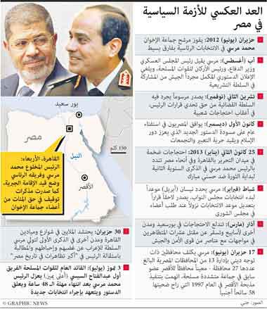 نزعة السيطرة على الدولة والتي حملت اسم «التمكين» قادت «الإخوان» إلى هاوية على حد وصف رئيس الحزب «المصري الديمقراطي الاجتماعي» محمد أبو الغار، مضيفاً لـ»الجريدة» أن «شهوة الإخوان للسلطة عجَّلت سقوطهم».اللحظة المعبرة للكشف عن انحيازات مرسي، جاءت عندما احتشد معارضوه في ميدان «التحرير» في الجمعة التالية لصدور الإعلان جمعة 23 نوفمبر 2012، في حين ذهبت قوى الإسلام السياسي لإعلان تأييدها أمام قصر «الاتحادية» الرئاسي، لتتجلى معالم الانقسام واضحة على المجتمع.سقوط مرسيبعد إصدار «الإعلان» بدأ سقوط مرسي الذي كان وقتها في قمة شعبيته عقب الإطاحة برئيس المجلس العسكري وزير الدفاع السابق المشير حسين طنطاوي تجمعت القوى المدنية وأعلنت تدشين جبهة «الإنقاذ الوطني» التي ضمَّت قوى ليبرالية ويسارية وناصريَّة قادها المعارض البارز محمد البرادعي ومعه عمرو موسى وحمدين صباحي وطالبت مرسي بالتراجع عن الإعلان الدستوري.رفض مرسي مطالب «الإنقاذ» لكن مستشاريه اعترضوا على سلوكه وأعلنوا استقالتهم تباعاً، في مقدمتهم الكاتبة سكينة فؤاد التي قالت لـ«الجريدة»: «حذرت مرسي من تداعيات إصدار الإعلان الدستوري وقلت له إن صدور ذلك الإعلان إسقاط لشرعيتك».لم يتأخر الرد فجاءت الدعوة من قبل «الإنقاذ» بتنظيم تظاهرات رافضة للإعلان فخرجت الملايين من طبقات الشعب في 4 ديسمبر 2012 معربة عن تخوفها من سرقة «الإخوان» هوية وطن، إلا أن مرسي فضل الاستعانة بالأهل لفض اعتصام معارضيه فكانت النتيجة اشتباكات بين الطرفين خلفت 10 قتلى أبرزهم الصحافي الحسيني أبو ضيف ليدشن مرسي قطيعة مع شعبه استمرت طوال الشهور الستة الأولى من عام 2013.صدام مع المؤسساتدخل مرسي وجماعته في صدام مباشر مع عدة مؤسسات منها القضاء فالإعلان الدستوري تضمن إقالة النائب العام المستشار عبدالمجيد محمود، وتعيين المستشار طلعت عبدالله، الذي كشف عن تبيعته للإخوان سريعاً، مما تسبب في نجاح حملة سحب الثقة من الرئيس مرسي (تمرد) بعد انطلاقها في 26 أبريل 2012، حيث تمكنت من تحويل الغضب الشعبي من حكم الإخوان إلى اصطفاف وطني ضد النظام، لم تفلح معه حركة «تجرد» الموالية للإخوان في حشد التأييد الكافي لمرسي فتهاوت شعبيته إلى الحضيض بعد جمع «تمرد» 22 مليون توقيع ضده على ما أعلنت.تزايدت في الأشهر الأخيرة من حكم مرسي الأزمات المتكررة للوقود وانقطاع التيار الكهربائي عن معظم البيوت المصرية فضلاً عن ارتفاع الأسعار وتزايد معدلات البطالة.ومثلما جاء مرسي من التحرير خرج منه ما جعل الميدان لايزال أيقونة الثورة المصرية حتى الآن، فمرسي الذي خرج أمام عشرات الآلاف ليخطب عقب وصوله للحكم في «التحرير» عادت الملايين إلى الميدان في 30 يونيو 2013، للمطالبة بـ«إسقاطه» وهو ما حدث في 3 يوليو الماضي.أحداث «سجن بورسعيد» فجَّر حكم محكمة "جنايات بورسعيد" أول مصاعب سنة 2013 على المصريين، ففي حين أطلقت رابطة مشجِّعي النادي الأهلي التراس أهلاوي "الشماريخ" ابتهاجاً بحكم محكمة جنايات بورسعيد بإحالة 21 متهماً أغلبهم من أهالي بورسعيد إلى مفتي الجمهورية، توجه أهالي المتهمين لمهاجمة سجن بورسعيد العمومي، مما أدى إلى سقوط ما يقرب من 52 قتيلاً منهم على مدى يومين.الملايين نزلوا في «30 يونيو»صباح يوم الأحد 30 يونيو شهدت مختلف المحافظات تظاهرات شارك فيها الملايين وطالبت بتنحي الرئيس السابق محمد مرسي. وفي القاهرة شهد ميدان التحرير ومحيط قصر الاتحادية مظاهرات شارك فيها مئات الآلاف ورفعت شعارات ضد «الإخوان» ومرسي، وقامت القوات المسلحة بتصوير الحشود من خلال الطائرات.البرادعي... متهرب من المسؤولية أم مخلص لمبادئه؟يعتبر د. محمد البرادعي الحاصل على جائزة نوبل في السلام واحداً من الوجوه المُحيِّرة في الثورة المصرية. واعتبر عند البعض متهرباً من المسؤولية، وعند البعض الآخر مخلصاً حتى النهاية لمبادئه الليبرالية. واتهم البرادعي بالتهرب من المسؤولية حين استقال من منصب «نائب رئيس الجمهورية للعلاقات الدولية» احتجاجاً