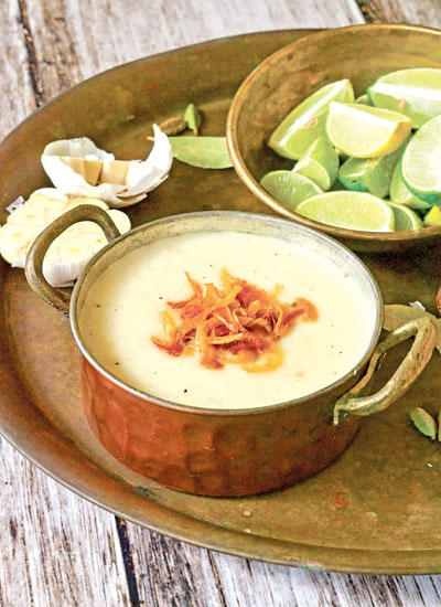 المكونات: الكمية: دقيق أرز نصف كوب زبادي كوب حليب كامل الدسم كوبان مرق دجاج ليتر بصلة مفرومة حبةشرائح بصل 3 حبات ثوم مفروم 3 فصوصجوزة الطيب 1/4 ملعقة صغيرة ملح وفلفل حسب الرغبة زبد ملعقة كبيرة زيت ذرة نصف ليتر للقليالطريقة1. في زيت وفير اقلي شرائح البصل للحصول على لون ذهبي.2. صفي شرائح البصل تماماً من الزيت مع الاحتفاظ بربع كوب من زيت القلي.3. في وعاء، اخلطي الحليب والزبادي ودقيق الأرز مع الاستمرار في الخلط حتى يمتزج الخليط تماماً.4. في وعاء الطهو، أضيفي كمية صغيرة من الزيت والزبدة وشوحي البصل المفروم إلى أن يذبل تماماً ويصبح شفافاً، ثم أضيفي الثوم والتوابل.5. صبي خليط الزبادي والحليب ودقيق الأرز وقلبي باستمرار على نار متوسطة، إلى أن يصل الخليط لبداية الغليان.اخفضي النار تماماً، ثم أضيفي زيت القلي الذي احتفظت به، وقلبي دقيقة على نار هادئة.6. ارفعي الحساء من على النار وقدميه ساخناً ومزينا بالبصل المقلي.طاجن الموزات بالخل والثومالمكونات: الكمية: موزات بتلو كغم طماطم مبشورة 7 حبات مرق لحم 5 أكواب خل نصف كوب ثوم مفروم 10 فصوص حبهان 5 فصوص لاورا 3 ورقات ملح وفلفل حسب الرغبة كزبرة جافة نصف ملعقة كبيرة بابريكا ملعقتان صغيرتان سمن ملعقة كبيرة الطريقة1. في إناء الطهي، أضيفي كمية من السمن واتركيها لتسخن.2. شوحي الموزات في السمن الساخن للحصول على لون بني ذهبي.2. أضيفي الثوم وورق اللاورا وجميع التوابل، عدا الكزبرة.3. عند حصول الثوم على لون ذهبي، أضيفي الكزبرة الجافة ثم الخل واتركي المزيج ليغلي دقيقتين.4. أضيفي الطماطم المبروشة عند الغليان ثم مرق اللحم، واتركي الخليط على النار لمدة 10 دقائق ثم ارفعيه من على النار.5. انقلي اللحم والصلصة إلى إناء فخاري (برام أو طاجن)، وأدخليه في فرن ساخن على درجة حرارة 200 درجة مئوية لمدة ساعة أو إلى أن ينضج اللحم تماماً وتتكثف الصلصة.6. اتركي الطاجن ليرتاح 10 دقائق، ثم قدميه مع الرز الأبيض.طاجن البازلاء والجزر بالريحانالمكونات: الكمية: بازلاء بالجزر مجمدة كغم بصل مفروم حبة ثوم مفروم 4 فصوص عصير بندورة كوبان مرق دجاج أو لحم كوبان صلصة الطماطم ملعقتان كبيرتان ريحان طازج نصف كوب صعتر طازج 10 أعواد بابريكا ملعقة صغيرة جوزة الطيب رشة قليلة ملح وفلفل أسود ملعقة سمن ملعقة متوسطة الطريقة1. شوحي البصل المفروم في السمن مع رشة ملح، ثم أضيفي الثوم وأعواد الصعتر وشوحي دقيقة. 2. أضيفي البازلاء بالجزر وتبلي بالملح والفلفل وجوزة الطيب والبابريكا، ثم شوحي قليلاً وأضيفي صلصة الطماطم واستمري بالتشويح لمدة دقيقتين.3. أضيفي عصير الطماطم ومرق الدجاج أو اللحم، ثم أوراق الريحان. اتركي الخليط على النار إلى أن يغلي لمدة خمس دقائق، ثم ارفعيه من على النار وانقليه إلى طاجن.4. ادخلي الطاجن إلى الفرن على درجة حرارة متوسطة واتركيه إلى أن تنضج الخضار وتتكثف الصلصة.5. عندما ينضج الطبق، أخرجي الطاجن من الفرن وارفعي أعواد الصعتر المتبقية، وقدميه مع الأرز الأبيض.مهلبية قمر الدين والبرتقال والقرفةالمكونات: الكمية: قمر الدين 3 شرائح ماء ليتر سكر كوب نشاء 4 ملاعق صغيرة و7 كبيرة قرفة عود حليب لتر برش برتقال حبتان فانيليا ملعقة صغيرة * مهلبية قمر الدين:-1 ضعي شرائح قمر الدين مع الماء على النار وقلبيها إلى أن تذوب تماماً.-2 صفي الخليط ثم أضيفي إليه السكر واتركيه على نار هادئة ليذوب السكر تماماً.-3 ذوبي النشاء في قليل من الماء وأضفيهما إلى الخليط.-4 حركي الخليط باستمرار كي لا يتكتل النشاء واتركيه على النار إلى أن يتكثف تماماً مع بداية الغليان.-5 ارفعيه من على النار واتركيه جانباً.* مهلبية البرتقال:-1 بعيداً عن النار، أضيفي جميع المكونات وهي برش البرتقال والكريما والفانيليا والنشاء والحليب ثم قلبيها حتى يذوب النشا تماماً.-2 ضعي الخليط على النار واستمري في التقليب إلى أن يبدأ بالغليان ويتكثف تماماً.-3 صفي المهلبية للتخلص من أي تكتلات من النشاء واتركيها جانباً.-4 حضري أكواب التقديم وابدئي بصب طبقة من مهلبية قمر ا