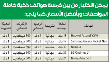 ويمكن للعملاء الاختيار بين 5 هواتف ذكية كاملة المواصفات وبأسعار تنافسية، وسيحصلون مجانا على شريحة جديدة تحتوي على رصيد 2 د.ك. و500 ميجابايت من خدمة الإنترنت شهريا، بشرط تعبئة الرصيد بدينار واحد شهريا فقط.