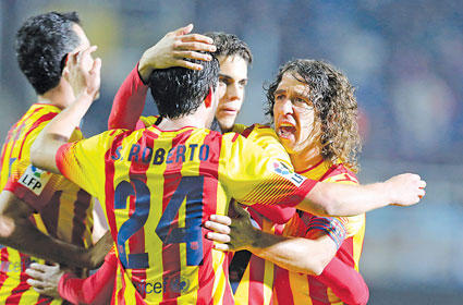 أنهى برشلونة أزمته القصيرة واستعاد نغمة الانتصارات مساء أمس الأول الجمعة في كأس ملك إسبانيا، بتحقيق فوز مريح على مضيفه قرطاجنة، الذي يلعب في دوري الدرجة الثالثة بنتيجة 4-1.وتقدم المهاجم المحلي فيرناندو لقرطاجنة في الدقيقة 16 من المباراة، إلا أن برشلونة رد بأربعة أهداف، حيث أحرز بيدرو هدفين، وأحرز سيسك فابريغاس، والكاميروني الشاب جان ماري دونغو الهدفين الآخرين.