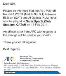 تلقت الكرة الكويتية مفاجأة غير سارة من الاتحاد الآسيوي لكرة القدم بنقل مباراة القادسية والجيش القطري إلى الدوحة، بعد قبول اعتراض الأخير بأحقيته في استضافة المباراة على أرضه لأفضليته في التصنيف.