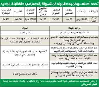 وحدد القرار مجموعة من المواد الخاضعة للصرف من حيث الكميات ونسبة الدعم اذ سيكون لكل صاحب حق في الرعاية السكنية حصة قدرها: 50 طنا من الحديد و100 متر مكعب من الطابوق و2000 كيس اسمنت و450 مترا مكعبا من الخرسانة الجاهزة و15 الف طابوقة اسمنتية كلها بدعم يبلغ 80 في المئة و650 مترا مربعا من الطابوق الجيري بدعم ثابت. وشدد القرار على ألا يكون قد انهي البناء بحيث يكون المبنى قد صار صالحا للسكن وفي حالة الانتهاء من الاعمال الخرسانية فلا يستفيد من دعم الحديد وفقا لاحكام هذا القرار ويتم إثبات ذلك عن طريق المعاينة من قبل المختصين في بنك الائتمان الكويتي.ويطبق في شأن صاحب العلاقة متى ما كان مالكا لبيت خاص ويرغب في هدمه وإعادة بنائه القواعد التالية: ان يكون قد حصل على قرض حديث الترميم من بنك الائتمان الكويتي او افادة من من البنك بتخصيص مبلغ لحساب الهدم واعادة البناء وتصرف الكمية، بالاضافة الى ان يقدم رخصة الهدم ورخصة حديثة لاعادة البناء.وبين القرار ان اللجنة المشكلة وفقا للبند 2 من المادة الأولى من القانون ستقوم بفحص كافة الطلبات المقدمة من طالبي قروض البناء في حالات الذين باشروا البناء ولم يصلهم التيار الكهربائي وحالات التبادل وبيع المنازل وشراء ارض او منازل جاهزة او شراء منازل قائمة وعليها البت في تحديد احتياجاتهم من المواد المدعومة خلال فترة 15 يوم عمل.