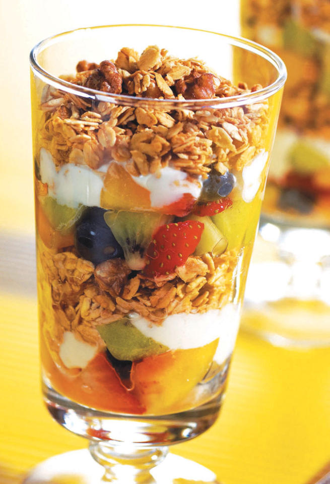 مدة التحضير: أقل من 15 دقيقة.مدة الطهو الفعلية: 15 إلى 30 دقيقة.327 سعرة حرارية في الحصة.المقادير:- كوب ونصف الكوب من رقائق الشوفان التقليدية.- نصف كوب من الجوز المقطع.- ثلث كوب من عصير القيقب.- ملعقتان صغيرتان من الزبدة.- كوبان من الفراولة المقطعة إلى شرائح.- كوبان من الدراق المقشر والمقطع إلى شرائح (نحو 4 حبات دراق متوسطة الحجم).- كوب من التوت الأزرق.- كوب من الكيوي المقشرة المقطعة إلى مكعبات (نحو 3 حبات).- كوبان من اللبن العادي الخالي من الدسم.الطريقة:1. اخلطي الشوفان مع الجوز في صينية خبز (22 سنتم*33 سنتم).2. امزجي ربع كوب من عصير القيقب والزبدة في قدر صغيرة غليظة القعر. واتركي الخليط على النار حتى يغلي.3. صبي خليط عصير القيقب فوق خليط الشوفان وحركيهما إلى أن يمتزجا جيدًا. ثم أدخلي الصينية إلى الفرن مدة 10 دقائق على حرارة 200 درجة مئوية، مع التحريك باستمرار. تابعي الخبز مدة 8 دقائق إضافية إلى أن يصبح المزيج ذهبي اللون ومقرمشًا. اتركي الغرانولا لتبرد بالكامل في الصينية (يمكنك إعدادها قبل أسبوع وتخزينها في وعاء مقفل الإحكام في موضع تكون حرارته معادلة لحرارة الغرفة).4. اخلطي برفق الفراولة، الكيوي، والملاعق الثلاث الكبيرة المتبقية من عصير القيقب في وعاء كبير.5. وزعي نصف خليط الفاكهة على ستة أكواب زجاجية، ثم أضيفي إليها نصف خليط الغرانولا ونصف كمية اللبن. أعيدي الكرة مع النصف المتبقي من كمية الفاكهة والغرانولا واللبن. قدميها في الحال.حليب بالبندقمدة التحضير الإجمالية: أقل من 15 دقيقة.مدة الطهو الفعلية: أقل من 15 دقيقة.عدد الحصص: 4 (128 سعرة حرارية/حصة).المقادير:- 3 أكواب من الحليب الخالي من الدسم أو الذي لا تتعدى نسبة الدسم فيه 1%.- كوبان من القهوة العادية.- ملعقتان كبيرتان من الشوكولا الطرية بنكهة البندق.- مسحوق القرفة (اختياري). الطريقة:1. سخني الحليب والشوكولا بالندق في المايكروويف أو في مقلاة، مع تحريكهما باستمرار إلى أن يمتزجا جيدًا ويتصاعد منهما البخار من دون أن يغليا.2. اخلطي القهوة مع مزيج الشوكولا ووزعي الخليط على أربعة أكواب مخصصة للتقديم. ثم رشي فوقها القرفة إن شئت. قدميها في الحال.فريتاتا صغيرةمدة التحضير: 15 إلى 30 دقيقة.مدة الطهو الفعلية: 15 إلى 30 دقيقة.الحصص: 6 (200 سعرة حرارية لكل حصة تتألف من حبتي مافن). تحصلين على 12 حبة مافن.قدّمي الفريتاتا الصغيرة الحجم مع سلطة الفاكهة الطازجة.المقادير:- كيلوغرام من البطاطا الحلوة.- 4 سوق من الكراث المفروم (الجزء الأبيض فحسب).- فصا ثوم مسحوقان.- 225 غرامًا من جبنة الفيتا الخالية من الدسم.- 6 حصص من خليط البيض.- نصف كوب من الحليب الخالي من الدسم.- رذاذ مانع للالتصاق (أو أوراق المافن) لطلاء صينية المافن.- ربع كوب من الماء.- قليل من الفلفل الأسود أو خليط توابل خالٍ من الملح.الطريقة:1. حمي الفرن على حرارة 170 درجة مئوية.2. قطّعي البطاطا الحلوة إلى مكعبات صغيرة واسلقيها أو اطهيها على البخار أو في المايكروويف إلى أن تطرى، ثم صفيها جيدًا وضعيها جانبًا.3. اطلي صينية المافن بالرذاذ أو ضعي فيها الأوراق المخصصة للمافن.4. اسلقي الكراث والثوم في الماء على حرارة متوسطة إلى أن يطريا، أي نحو 10 دقائق، ثم اتركيهما جانبًا ليبردا.5. اخلطي الكرث مع الفيتا والبطاطا الحلوة. ووزعي الخليط على قوالب المافن.6. امزجي خليط البيض مع الخليب الخالي من الدسم وطيبيهما بالفلفل أو خليط التوابل. صبي بعد ذلك خليط البيض في قوالب المافن إلى أن تملئي ثلاثة أرباع كل منها. اضغطي الخضار برفق نحو الأسفل.7. ادخلي الصينية إلى الفرن مدة 25 إلى 30 دقيقة، أو إلى أن يصبح لون الفريتاتا ذهبيًّا وتشتد. ضعي الصينية جانبًا مدة 5 دقائق، ثم أخرجيها برفق بواسطة سكين.