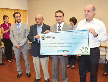سلم السفير الكويتي المعتمد لدى الأرجنتين صلاح المطيري أمس التبرع المالي المقدم من دولة الكويت، والبالغ ثلاثة ملايين بيسو أرجنتيني أي ما يعادل حوالي 500 ألف دولار، إلى الحكومة الأرجنتينية لتمويل مشروع توسعة قسم علاج أمراض الدم والأورام في مستشفى "غاراهان".حضر حفل تسليم التبرع الكويتي نائبة وكيل وزارة الخارجية الأرجنتينية السفيرة ماريا ديل كارمن سكيف، ومدير إدارة الشرق الأوسط وشمال إفريقيا بالوزارة السفير هرنان روبيرتو بلوروتي، بالإضافة إلى مدير المستشفى وعدد من الأطباء، حيث حظي بتغطية إعلامية محلية واسعة.