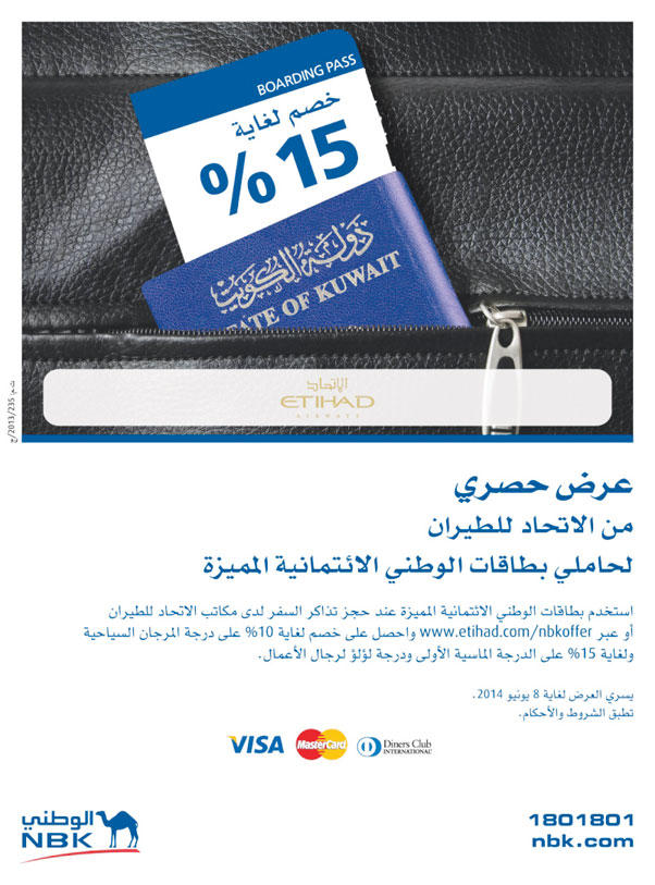 يواصل بنك الكويت الوطني عرضه الحصري لحاملي بطاقاته الائتمانية المميزة متضمناً خصومات حصرية على تذاكر السفر من الاتحاد للطيران. ويستمر هذا العرض على جميع رحلات ووجهات سفر الاتحاد للطيران لغاية 8 يونيو 2014. ويحصل حاملو بطاقات الوطني الائتمانية المميزة: فيزا إنفينيت، ورلد ماستركارد، فيزا وماستركارد بلاتينوم، ماستركارد تيتانيوم، داينرز كلوب على خصم بنسبة 10 في المئة على تذاكر الدرجة السياحية و15 في المئة على تذاكر الدرجة الأولى الماسية ودرجة لؤلؤة رجال الأعمال إلى كافة الوجهات التي تغطيها شركة الاتحاد للطيران، وذلك عند حجز تذاكرهم عبر مكتب الاتحاد للطيران أو عبر الموقع الالكتروني للاتحاد للطيران في دولة الكويت.