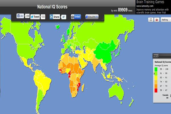 صدارة عراقية وبعيداً عن رمزية مقياس "الآي كيو"، فقد كشفت الدراسة عن متوسط نسبة ذكاء شعوب العالم، عن تصدر العراقي قائمة البلدان العربية بمتوسط 87 درجة، مما جعل العراق يحتل المرتبة 21 عالمياً.وجاءت الكويت في المركز الثاني عربياً بـ 86 درجة، ثم اليمن 85 درجة، وتقاربت الإمارات والأردن والسعودية والمغرب في الترتيب، وهو 23- و24 عالمياً، والرابع عربياً بمتوسط ذكاء 84 درجة بعد العراق والكويت واليمن، فيما حصدت الجزائر والبحرين وليبيا وعمان وسوريا وتونس المرتبة الخامسة عربياً بنفس الدرجة وهي 83، مما جعل الدول المشار إليها تقع في المركز الـ 25 عالمياً. تراجع مصري لبناني على الرغم من الشهرة التي تتمتع بها مصر ولبنان على المستويات الثقافية والفنية، والحراك السياسي والإجتماعي أكثر من غيرهما من الدول العربية، إلا أن إختبار الذكاء العالمي وضعهما في ترتيب متأخر نسبياً، فقد حصل اللبناني على 82 درجة، والمصري 81 درجة، فيما حصل القطري على 78 درجة والسوداني على 71 درجة مما جعلهما في مؤخرة الترتيب على المستوى العربي. القمة آسيوية إيطالية إحتلت سنغافورة الصدارة بمعدل ذكاء 108، وهو يفوق المتوسط العالمي بصورة ملحوظة، فيما جاءت كوريا الجنوبية في المرتبة الثانية بـ 106 درجات، ثم اليابان 105، وفي المركز الرابع كان ظهور أول دولة أوروبية وغربية وهي إيطاليا التي حصل مواطنها على 102 درجة بمقياس الذكاء العالمي "آي كيو"، ثم أيسلندا، ومنغوليا، وسويسرا، والنمسا، والصين والتي يتوافق المعدل بها مع المستوى العالمي الجيد، وهو 100 درجة. أين القوى العظمى؟ قد لا يكون هناك رابط مؤكد بين متوسط الذكاء في دولة ما، وبين النهضة الحضارية والإقتصادية، حيث تحتل منغوليا على سبيل المثال المرتبة السادسة عالمياً، فيما يتراجع ترتيب الولايات المتحدة مقارنة مع كثير من دول العالم، حيث يبلغ المتوسط في الولايات المتحدة 98 درجة، وهو أقل من المعدل العالمي الجيد، ويشارك أميركا في درجة الذكاء ذاتها كل من إسبانيا وفرنسا وألمانيا، في حين يبلغ متوسط ذكاء البريطاني 100 درجة، وعلى مقربة من القوى العظمى ستقر روسيا بمتوسط 97 درجة. أفريقيا ليس لها نصيب! في الوقت الذي إحتل العرب المنطقة الدافئة في جدول الترتيب العالمي، حيث لم يتمكنوا من مجاراة الأذكياء، ولكنهم في الوقت ذاته لا يمكن وصفهم بالغباء وفقاً لإختبار "الآي كيو"، وجاء في ذيل الترتيب العالمي بعض الدول الأفريقية، وهي الكاميرون، والغابون، وموزمبيق بمتوسط 64 درجة، فيما احتلت غينيا الاستوائية المركز الأخير بـ 59 درجة. القائمة Rank -------- Country ----------------------- % ------------- 1 Singapore 108 2 South Korea 106 3 Japan 105 4 Italy 102 5 Iceland 101 5 Mongolia 101 6 Switzerland 101 7 Austria 100 7 China 100 7 Luxembourg 100 7 Netherlands 100 7 Norway 100 7 United Kingdom 100 8 Belgium 99 8 Canada 99 8 Estonia 99 8 Finland 99 8 Germany 99 8 New Zealand 99 8 Poland 99 8 Sweden 99 9 Andorra 98 9 Australia 98 9 Czech Republic 98 9 Denmark 98 9 France 98 9 Hungary 98 9 Latvia 98 9 Spain 98 9 United States 98 10 Belarus 97 10 Malta 97 10 Russia 97 10 Ukraine 97 11 Moldova 96 11 Slovakia 96 11 Slovenia 96 11 Uruguay 96 12 Israel 95 12 Portugal 95 13 Armenia 94 13 Georgia 94 13 Kazakhstan 94 13 Romania 94 13 Vietnam 94 14 Argentina 93 14 Bulgaria 93 15 Greece 92 15 Ireland 92 15 Malaysia 92 16 Brunei 91 16 Cambodia 91 16 Cyprus 91 16 FYROM 91 16 Lithuania 91 16 Sierra Leone 91 16 Thailand 91 17 Albania 90 17 Bosnia and Herzegovina 90 17 Chile 90 17 Croatia 90 17 Kyrgyzstan 90 17 Turkey 90 18 Cook Islands 89 18 Costa Rica 89 18 Laos 89 18 Mauritius 89 18 Serbia 89 18 Suriname 89 19 Ecuador 88 19 Mexico 88 19 Samoa 88 20 Azerbaijan 87 20 Bolivia 87 20 Brazil 87 20 Guyana 87 20 Indonesia 87 20 Iraq 87 20 Myanmar (Burma) 87 20 Tajikistan 87 20 Turkmenistan 87 20 Uzbekistan 87 21 Kuwait 86 21 Philippines 86 21 Seychelles 86 21 Tonga 86 22 Cuba 85 22 Eritrea 85 22 Fiji 85 22 Kiribati 85 22 Peru 85 22 Trinidad and Tobago 85 22 Yemen 85 23 Afghanistan 84 23 Bahamas, The 84 23 Belize 84 23 Colombia 84 23 Iran 84 23 Jordan 84 23 Marshall Islands 84 23 Micronesia, Federated States of 84 23 Morocco 84 23 Nigeria 84 23 Pakistan 84 23 Panama 84 23 Paraguay 84 23 Saudi Arabia 84 23 Solomon Islands 84 23 Uganda 84 23 United Arab Emirates 84 23 Vanuatu 84 23 Venezuela 84 24 Algeria 83 24 Bahrain 83 24 Libya 83 24 Oman 83 24 Papua New Guinea 83 24 Syria 83 24 Tunisia 83 25 Bangladesh 82 25 Dominican Republic 82 25 India 82 25 Lebanon 82 25 Madagascar 82 25 Zimbabwe 82 26 Egypt 81 26 Honduras 81 26 Maldives 81 26 Nicaragua 81 27 Barbados 80 27 Bhutan 80 27 El Salvador 80 27 Kenya 80 28 Guatemala 79 28 Sri Lanka 79 28 Zambia 79 29 Congo, Democrati