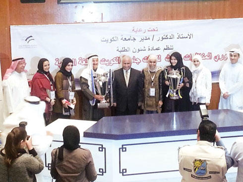 تغلب فريق طالبات كلية العلوم الاجتماعية في جامعة الكويت على فريق طلاب كلية الآداب، في منافسات نهائي دوري المناظرات باللغة العربية أمس، في الحرم الجامعي بالشويخ، على مسرح المغفور له الشيخ عبدالله الجابر.ودارت المناظرة حول موضوع "قرر هذا المجلس أنه يجب إلغاء تأنيث المرحلة الابتدائية في مدارس البنين في الكويت"، لعب خلالها في دور المعارضة فريق طالبات كلية العلوم الاجتماعية، وفي دور الموالاة فريق طلاب كلية الآداب، وشهدت المناظرة مهارات عالية وتقاربا كبيرا في المستوى لكلى الفريقين.