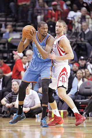 تألق النجم كيفن دورانت في صفوف اوكلاهوما سيتي ثاندر، وسجل 36 نقطة، ليقلب الطاولة على هيوستن روكتس، ويقود فريقه الى الفوز 104-92، ضمن دوري كرة السلة الاميركي للمحترفين.وكان هيوستن في طريقه الى تحقيق الفوز عندما تقدم بفارق 14 نقطة في نهاية الشوط الاول، لكن لاعبيه اهدروا 14 محاولة من الرميات الثلاث في الربعين الاخيرين، واكتفوا بتسجيل 19 نقطة فقط.
