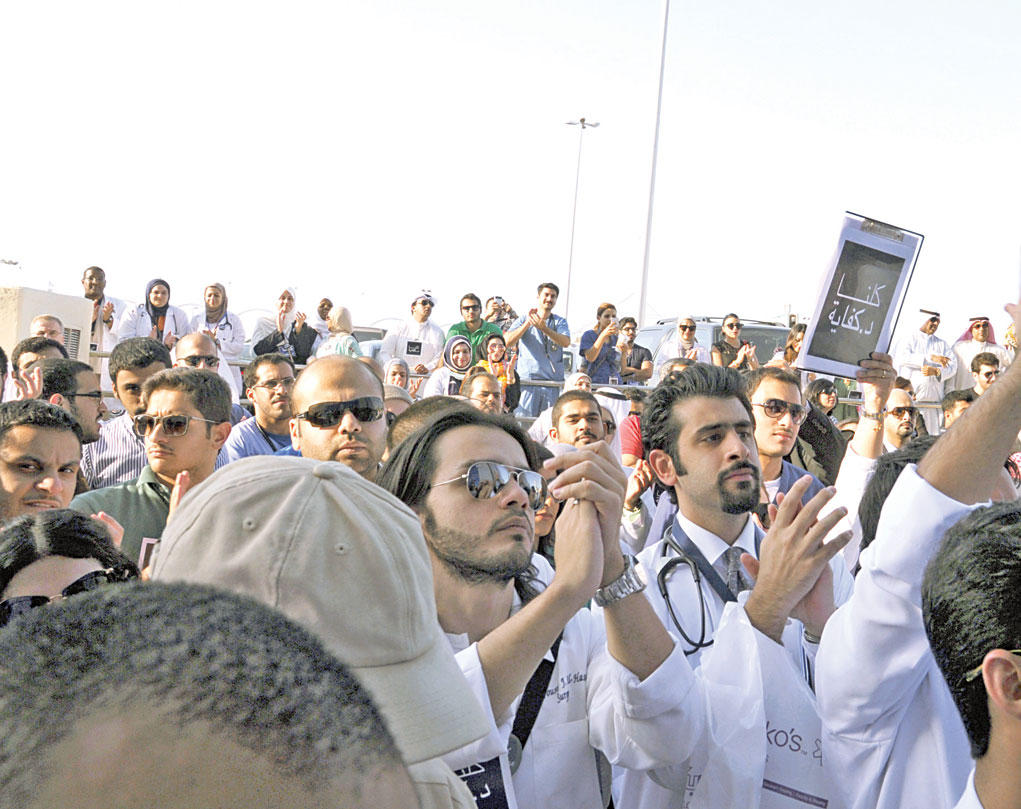 الأطباء لوزير «الصحة»: بداية اعتصامات متكررة حتى وقف القرار المتعسفاحتشد نحو 200 طبيب وطبيبة في المستشفى الأميري احتجاجاً على قرار وزير الصحة الشيخ محمد العبدالله نقل رئيسة قسم التخدير والعناية المركزي د. كفاية عبدالله ملك إلى مستشفى الأمراض السارية بعد رفضها أمر الوزير إبقاء مريض لا تستدعي حالته الصحية في غرفة العناية المركزة رغم حاجة مريض آخر إلى الغرفة.