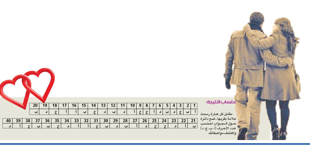 * غالبية من أحرف {أ}: في الحب، أنت طفل!في اللاوعي: أنا أولاً!يركز الطفل على نفسه ويتمتع بنزعة فردية ويثق بسلطته المطلقة لأنه لا يدرك بعد معنى حقوق الآخر، ويعتبره مجرد أداة لتنفيذ رغباته. ينتظر منه أن يلبي حاجاته وينظر إليه حصراً كغرض أو شريك في اللعب. بين عمر الرابعة والثامنة، يكون الفضول محركاً قوياً ويبقى التركيز محدوداً وتظهر مشاعر الكسل والضجر. يعكس السلوك العاطفي الطفولي استحالة الشعور بالخوف من الآخر. يمكن أن تنتابه الرغبات والانفعالات نفسها وقد يصبح الاختلاف سبباً للتصادم. لكن يمكن أن نهمل الغرض الذي نستمتع به في البداية أو نبتعد عنه حين يتلاشى السحر الذي طبع الغرض الجديد. هذه النزعة الأنانية تصعّب التبادل والتفاوض والتسوية. في حال وقوع خلاف، يميل هذا الشخص إلى فرض نفسه وإثبات صوابية قراراته والفوز بالجدل.الإيجابيات: الفضول، السحر، الحماسة، الإبداع، الطاقة.السلبيات: التعنت، التقلب، قلة التعاطف، عدم تحمّل الإساءة.السير نحو التوازن: يجب تقبل الآخر والاعتراف به، وذلك من خلال تخصيص وقت لازم للإصغاء إليه من دون مقاطعته أو الحكم على كلامه، لا سيما في حال وقوع خلاف. بعد أن يعبّر الآخر عن رغباته وحاجاته، يمكنك أن تعبّر عن نفسك قبل أن تبحثا معاً عن وسيلة ترضي الطرفين من خلال تخفيف حدّة استياء كل فريق.* غالبية من أحرف {ب}: في الحب، أنت مراهق!في اللاوعي: قوة مفرطة أو ضعف شديد!يميل المراهق إلى المثالية حيناً ويبحث عن مشاعر جارفة أحياناً. يحتاج إلى التوجه نحو الآخر، ذلك الكائن المختلف الذي يربكه ويخيفه، كي يتماهى معه. في الوقت نفسه، يرتكز على دوافعه وتوقه إلى معرفة حدوده، لذا يحتاج إلى مضاعفة تجاربه. يعيش في وهم الخلود، ما يفسر سلوكياته التي تحمل الكثير من المجازفة. يتضح هذا الجانب في سن الرشد عبر موقف متناقض: بحث عن توأم روح فريد من نوعه كي يسدّ جميع نواقصه مقابل اختبار جميع مصادر المتعة، لا سيما كل ما هو جديد، ما يبرر صعوبة التواصل مع الآخر وتقبّل عيوبه وحدوده ورفض كل ما يرتبط بالمظاهر الروتينية والمتكررة. في معظم الأحيان، لا يدرك الراشد {المراهق} هذا الطابع المزدوج في شخصيته، ما يمهد لمعاناة كبيرة عند انتهاء أي علاقة، حتى لو كان هذا الشخص هو سبب الانفصال.الإيجابيات: الحساسية، النزعة المثالية، الجرأة.السلبيات: التقلب، الدوافع الغرائزية، نقص العمق الداخلي، عدم تقبل الحدود الذاتية.السير نحو التوازن: لا بد من العودة إلى الذات. تسمح تجربة الغوص في أعماق الذات، عبر العلاج النفسي أو جلسات التأمل، بالتخلي عن وهم العالم {الخارجي} الأبدي الذي يعج بالشهوات أو التوق إلى شريك مثالي يمكن أن يلبي جميع الرغبات.* غالبية من أحرف {ج}: في الحب، أنت راشد!في اللاوعي: 1+1=3!العالم مكوّن من {الأنا} و{الآخر}، وهما يساويان {نحن}. ثمة جزء إضافي من الذات ومن الآخر لكننا نغفل عنه: كتلة اللاوعي والرغبة والغموض. المعرفة والبراعة في تدبّر الأمور تضمنان التماسك وتعديل المواقف وعدم انتظار أن يسد أحد حاجاتنا ورغباتنا بالكامل. يمكن اكتساب نضج عاطفي عبر إدراك حدودنا وحدود الآخرين. هذه الميزة هي نتاج دروس مستخلصة من تجارب ماضية مثل القدرة على التطور وتقبل التقلبات في مشاعر الحب. قد تتألف الحلول من ثلاث ركائز: المرونة والوضوح والنسبية. كذلك، يتسم هذا الشخص الناضج عاطفياً بمستوى جيد من تقدير الذات واحترام الشريك، باعتباره شخصاً مختلفاً لديه رغباته الخاصة. يعني ذلك على الأرجح القدرة على إنهاء أي علاقة لا ترتكز على الثقة أو الاحترام. في المقابل، يصبح التواصل سهلاً في العلاقات السليمة، لكن لا يعني ذلك عدم وقوع خلافات أو صراعات.الإيجابيات: تواصل صادق، واقعية، تعاطف، قدرة على تجديد الذات.السلبيات: ميل إلى تفضيل المنطق على العاطفة أو الارتجال.السير نحو التوازن: يجب أن تدرك أن كل توازن لا يكون مستقراً بطبيعته. عوامل الالتزام والثبات والبناء المشترك لا تضمن تفوّق مشاعر الحب. بل التنافر والأحداث غير المتوقعة ونس