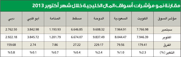 عم اللون الاخضر مؤشرات اسواق مجلس التعاون المالية كمحصلة لنهاية الشهر المنصرم (اكتوبر)، لكن بمكاسب متفاوتة، وكانت القيادة كالعادة لمؤشر سوق دبي المالي الذي اضاف 5.8 في المئة، تلاه سوقا الدوحة والكويت بمكاسب لم تبلغ نصف مكاسب الاول، وتراوحت بين 2.3 و2.4 في المئة على التوالي، ثم السوق السعودي الاكبر عربيا الذي ربح 1 في المئة، وتراوحت مكاسب بقية الاسواق بين 0.7 و0.2 في المئة فقط.واستمرت مؤشرات الامارة الخليجية الشهيرة في تحقيق نمو مطرد خلال هذا العام، والتي من ضمنها مؤشر سوق المال، حيث حقق خلال الشهر الماضي نموا بنسبة 5.8 في المئة، ليقفل قريبا من مستوى نفسي مهم هو 3 آلاف نقطة، حيث اضاف حوالي 160 نقطة ليقفل على مستوى 2922 نقطة.وكان دعم سوق دبي نتيجة عوامل اقتصادية عالمية، اضافة الى نمو اقتصاد الامارة واداء شركاتها القيادية الكبرى، بقيادة شركة اعمار العقارية التي حققت نموا ملحوظا على مستوى ارباح الربع الثالث فاق توقعات المراقبين، بينما على مستوى الاقتصاد العالمي كانت حلحلة ملف الديون الاميركية ورفع سقف الدين السيادي للولايات المتحدة احد محركات الاسواق العالمية وسوق دبي، الذي يتداول بجزء مهم منه مستثمرون اجانب يتأثرون اكثر بمعطيات ومؤشرات اقتصادية عالمية تحركهم للتوجه لاسواق ناشئة والتي يعتبر سوق دبي من اهمها.قطر والكويتسجل سوقا قطر والكويت مكاسب متقاربة، حيث اقترب مؤشر الأول من مستوى 10 آلاف نقطة اخرى وبخطى اكثر ثقة من جولته الاولى في النصف الاول من هذا العام، والتي تخطى خلالها هذا الحاجز لكن دون استقرار عليه.وحقق «الدوحة» بنهاية تعاملات اكتوبر نموا بنسبة 2.4 في المئة مقارنة باقفال الشهر الاسبق، مقفلا على مستوى 9837.5 نقطة تقريبا بعد أن اضاف 229.17 نقطة، مستفيدا من مكاسب ما بعد عطلة عيد الاضحى واعلانات بعض شركاته القيادية للربع الثالث التي حققت من خلالها نموا مرضيا لمستثمري السوق. وحققت مؤشرات سوق الكويت للاوراق المالية الرئيسية ارتفاعات جيدة، وكان التراجع اللافت لحجم التعاملات وسيولتها، حيث سجل المؤشر السعري نموا هو الاكبر بنسبة 2.3 في المئة، اي 179.41 نقطة، ليقفل على مستوى 7946.39 نقطة، بينما اكتفت المؤشرات الوزنية بنسبة 1 في المئة، حيث حقق الوزني ارتفاعا بنحو 4.7 نقاط، ليقفل على مستوى 467.4 نقطة، ولم تزد مكاسب كويت 15 عن ذلك، واستطاع الاقفال على مستوى 1100 نقطة المهم.وكانت التراجعات واضحة من حيث النشاط والسيولة، وكانت بنسبة 20.5 في المئة بالنسبة للاول مقارنة بالشهر الاسبق، وانخفضت السيولة بنسبة 24 في المئة وعدد الصفقات بنسبة اكبر قليلا كانت 25.3 في المئة.تذبذب «السعودية»تذبذب مؤشر «تداول» السعودي كثيرا على مستوى 8 آلاف نقطة، وبعد تردد وتذبذب انتهى الى الاستقرار فوقه بأكثر من 44 نقطة، بعد مكاسب بنسبة 1 في المئة كانت تعادل نحو 80 نقطة، وتميز السوق السعودي بالاعلان السريع عن نتائج شركاته المدرجة الفصلية التي سجلت نموا عاما دعم تداول اسهمها وباستثناء الشركة الكبرى سابك، والتي تأثر سهمها سلبا بعد اعلانه، ما شكل ضغطا على مؤشر السوق استطاع تجاوزه بفضل ما تلاه من اعلانات بنمو مرض لمعظم الشركات المدرجة.وبعد ارتباط وثيق بين مؤشر تداول واسعار النفط خف هذا الارتباط واصبح المؤشر السعودي اكثر تأثرا بمعطيات اقتصادية اخرى، اهمها نتائج مكونات مؤشر «تداول» القيادية.مكاسب محدودةأداء أسواق مسقط وابوظبي والمنامة كان بالحجم نفسه خلال الشهر الماضي، وكان المنامة افضلها بمكاسب بلغت 0.7 في المئة، ليبقى متماسكا فوق مستوى 1200 نقطة، بل اعلى منه بنحو 1.5 نقطة، رابحا 7.8 نقطة، وكان مسقط اقل من ذلك نسبيا، حيث لم تتجاوز مكاسبه 0.4 في المئة، ليقفل على مستوى 6674 نقطة، مضيفا 27.2 نقطة.وكان ابوظبي الاقل من حيث النمو الشهر المنصرم، وبنسبة لم تتجاوز عشري النقطة، اي 2.4 نقطة، ليقفل قريبا من مستوى اقفاله الشهر الاسبق عند 2845.7 نقطة، ولم يستفد مؤشر ابوظبي من نمو الاسواق الخليجية بعد عطلة العيد، وبقي على مستوى تذبذب منخفض، وهو ما يمي