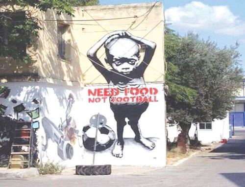 رسم البرازيلي باولو إيتو (فنان شارع برازيلي) على جدار في أحد أحياء مدينة ساو باولو البرازيلية رسم غرافيتي لطفل يبكي، تبدو عليه علامات الفقر والجوع ويجلس على طاولة لتناول الطعام ولكنه لا يجد على الطبق أمامه سوى كرة قدم. كان هذا الرسم كافياً لإشعال قضية الفقراء في الوجدان، القضية الكبرى التي ما عادت تهمّ الإعلام كثيراً أمام الهوس بالمشاهير والقضايا الميديائية والباباراتزية ومنها الى نجوم كرة القدم وعشيقاتهم وثرواتهم وثيابهم وأنماط عيشهم وأماكن سكنهم، وحتى علاقاتهم الخاصة.
