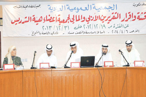 وقال رئيس الجمعية د. محمد الخضر، في تصريح صحافي عقب الاجتماع، إن أهم أعمال وإنجازات الجمعية خلال هذه الفترة رفع سن التقاعد لعضو هيئة التدريس إلى ٧٥ عاما، وإلغاء أسبوع ما قبل الدراسة لأعضاء هيئة التدريس، ورفع بدل الإيجار والتأمين الصحي المجاني، بالتعاون مع بنك بوبيان، وغيرها من الإنجازات والأعمال المختلفة.تعديلات مستحقةوأكد الخضر أن "مطلبنا الأساسي هو إقرار كادر أعضاء هيئة التدريس والتعديلات المستحقة على مدرسي اللغات والمدرسين المساعدين، وقد أوصلنا للوزير السابق د. نايف الحجرف أنه طفح الكيل بالجامعة، والتقينا المسؤولين بديوان الخدمة المدنية، واللجنة التعليمية بمجلس الأمة، وسمو رئيس مجلس الوزراء". وشدد على ان "جميع المسؤولين أكدوا تأييدهم لمطالبنا ودعمهم لنا، وقلنا لسمو رئيس الوزراء إن الوضع سيئ بالجامعة"، مضيفا: "إذا كان التصعيد هو الوسيلة الوحيدة فليكن قرار التصعيد صادرا من الجمعية العمومية".وأشار إلى أنه تم التعدي على اللوائح الجامعية أكثر من مرة، آخرها من خلال إقرار اللجنة المركزية للتعيينات التي تتجاهل رأي القسم العلمي والكلية في التعيين، وتشكيل هذه اللجنة فيه مخالفة صريحة، وحقوق أعضاء هيئة التدريس خط أحمر بما فيها حقوق الأقسام العلمية والكليات، مؤكدا أن الجمعية ستفعل كل الأدوات النقابية للحصول على حقوق الهيئة التدريسية.عمل مهنيمن جانبه، ذكر نائب رئيس جمعية أعضاء هيئة التدريس د. ناصر الشمري: "اننا سعينا وحاولنا التخفيف عن اخواننا المدرسين المساعدين ومدرسي اللغات، وقمنا بعمل مهني في تتبع الخطوات الفعلية والمطلوبة، لكننا نرى وجود تعيين لأساتذة بجامعة الكويت".وزاد د. الشمري: "اما المدرسون المساعدون من حملة الدكتوراه فهم أولى بالتعيين من غيرهم، لأنهم أبناء الجامعة، ويقومون بمهام التدريس فيها، إلا أن هناك لوائح تمنع هذا الأمر، وشكلنا لجانا للوصول إلى الحل المناسب، وتم تقديم العديد من المقترحات لمدير الجامعة لكنه لم يرد علينا، وحقيقة إنه غير متعاون معنا".وتابع ان "دورنا يكون عبر الضغط من خلال مجلس الأمة والصحافة، لكن لم نر الاهتمام المطلوب من قبل مجلس الأمة بالقضايا الجامعية وقضايا أعضاء هيئة التدريس، فالمفترض منه الضغط على الوزير ومدير الجامعة، أما اللجنة التعليمية في السابق فكانت حريصة على الجامعة".
