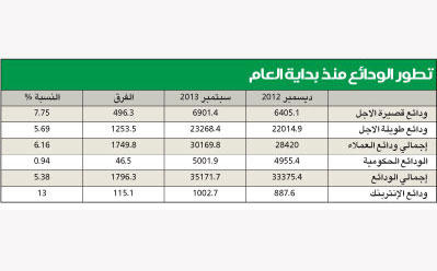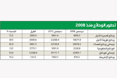 حققت ودائع البنوك ارتفاعا كبيرا منذ خمس سنوات، مع بداية الأزمة المالية حتى الآن، حيث ارتفع إجماليها من 22.905 مليار دينار في نهاية ديسمبر 2008 إلى 35.171 مليارا في نهاية سبتمبر 2013، بزيادة 12.266 مليارا وبنسبة 53.6 في المئة.