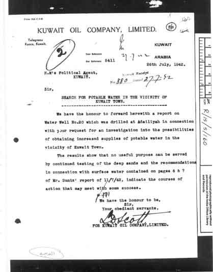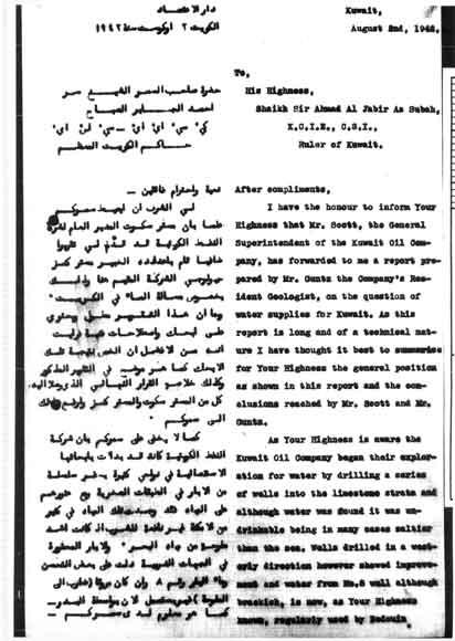 وثيقة لها تاريخ: «نفط الكويت» تقدم تقريراً عن المياه في الكويت للشيخ أحمد الجابر سنة 1942
