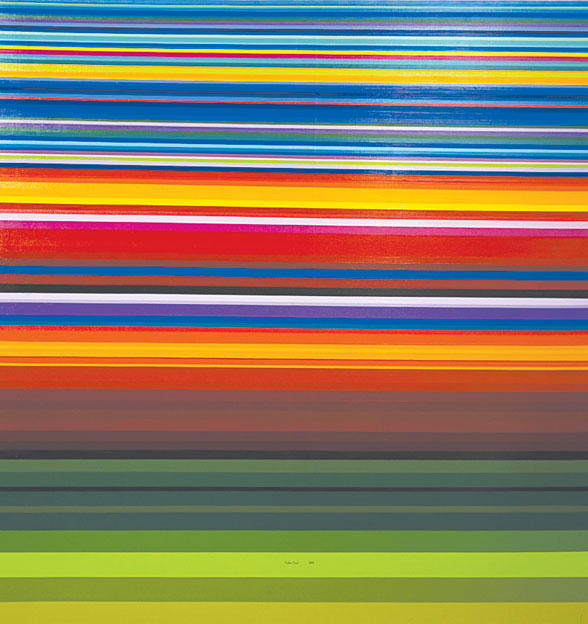 أعمال متفائلةورغم أن مراد يرسم وفقاً لتجاربه الخاصة في الحياة والصراعات، فإن أعماله في غاليري {أيام} تأتي متفائلة بشكل متحد، حاملة عناوين تتضمن الجمال والأمل، فمجموعته الجديدة ترفض السلبية وتكون بمثابة عملية شفاء للفنان. في {تجربة رقم 91، عندما يزهر ربيع}، يتحدى مراد استخدام موسم الربيع في مصطلح ما سمي {الربيع العربي}، والذي أصبح مرتبطاً على نحو متزايد بالعنف والفوضى، ويستخدم ألواناً تستدعي إلى الذهن تفتح الحياة خلال فصل الربيع.وتتغلغل لغة مراد البصرية التجريبية والرؤيوية الخاصة في إدراكه للبيئة المادية وربما الاستهلاكية، حيث يعتبر فعل المراقبة أكثر فاعلية من محاولات صنع تمثيلات واقعية للحياة فهو يلغي الأشياء والمسافات ويختصرها في بعده اللوني وطريقة هندسته في اللوحة. ففي عمله المكون من نطاقات من ألوان الأزرق الغامق والأحمر تحت عنوان تجربة {رقم 90 في منتصف الليل الدافئ}، يقدم مراد مشهداً لمبان مرسومة في فترة تعم فيها الظلمة والعتمة، وهي تجربة يصفها الفنان بـ{مشاهدة الليل أفقياً}. حيث يصور البنى العمودية كمجموعة من الخطوط الأفقية التي تتلاشى تدريجاً الى الظلمة نحو الجزء العلوي من قماش اللوحة، كذلك تنحسر إلى البعيد. وتبث التجربة السمعية ذاتها في لوحات مراد، كما نراها في تجربته البصرية، حيث يظهر ذلك في عمل {تجربة رقم 86، رؤية في الحلم الأزرق}. حيث نفذها الفنان أثناء استماعه الى الموسيقى، فأصبح العمل بمثابة ترجمة بصرية للصوت، مستحضراً بذلك الموسيقى الميتال التي كان يسمعها مراد في شبابه.قد يجد المواطن العادي صعوبة في فهم لوحات مطيع مراد، لكن من دون شك هي لوحات فيها بصمة خاصة لفنان بات اسمه معلوماً في العالم العربي.ولد مراد في حمص عام 1977، ويعيش ويعمل في القاهرة. أنهى دراسته في التصميم الإعلامي عام 2005 وحصل على شهادة من كلية الفنون الجميلة عام 2001 وهو عضو نقابة الفنون الجميلة في سورية. شارك في معارض جماعية في سورية كمعرض الشباب الثالث عام 2002 والرابع عام 2003 والخامس هذا العام. والمعرض السنوي من عام 2002 حتى عام 2005 كما شارك في بينالي المحبة الخامس في اللاذقية، والمعرض الشخصي في صالة كشنار غاليري في دمشق، ومعرض شخصي في الأردن.* يستمر المعرض حتى 12 ديسمبر 2013.