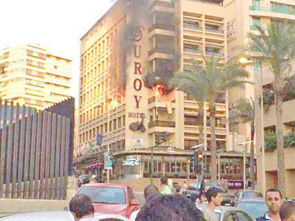 في ضربة أمنية جديدةٍ وَضعت لبنان في عين عاصفة التطورات في المنطقة، فجر انتحاري نفسه أمس داخل غرفته في الطابق الرابع في فندق «دي روي» في الروشة ببيروت، أثناء مداهمة قوات الأمن العام الفندق لاعتقاله ما أسفر عن مقتل رجلي أمن. وقامت قوات الأمن بمداهمة غرف الفندق واعتقلت ثلاثة أشخاص على الأقل بينهم موظف سوداني الجنسية في الفندق القريب من السفارة السعودية.وشهد لبنان في الأيام القليلة الماضية ضربات أمنية موجعة، حيث فجر انتحاري نفسه في نقطة ضهر البيدر الحدودية مع سورية، كما فجر آخر نفسه قرب حاجز للجيش في ضاحية بيروت الجنوبية.