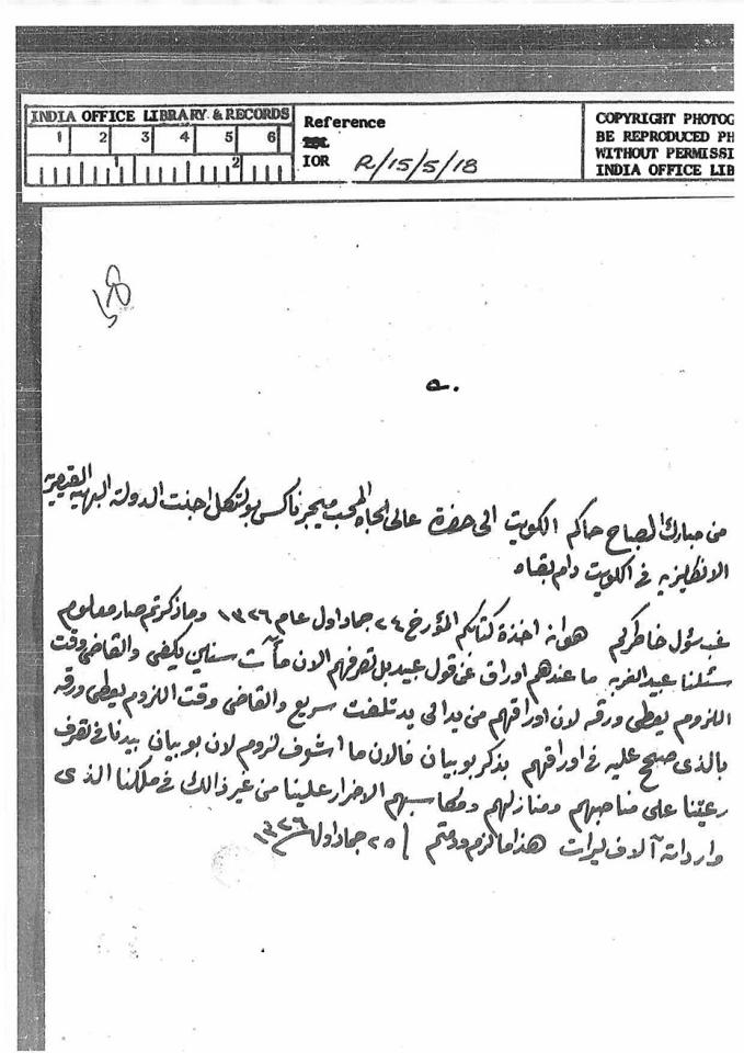 وثيقة لها تاريخ : «عبيد الغربة» يفيد الشيخ مبارك بأن أوراق العوازم بخصوص حظائر السمك في بوبيان تلفت مع مرور الزمن