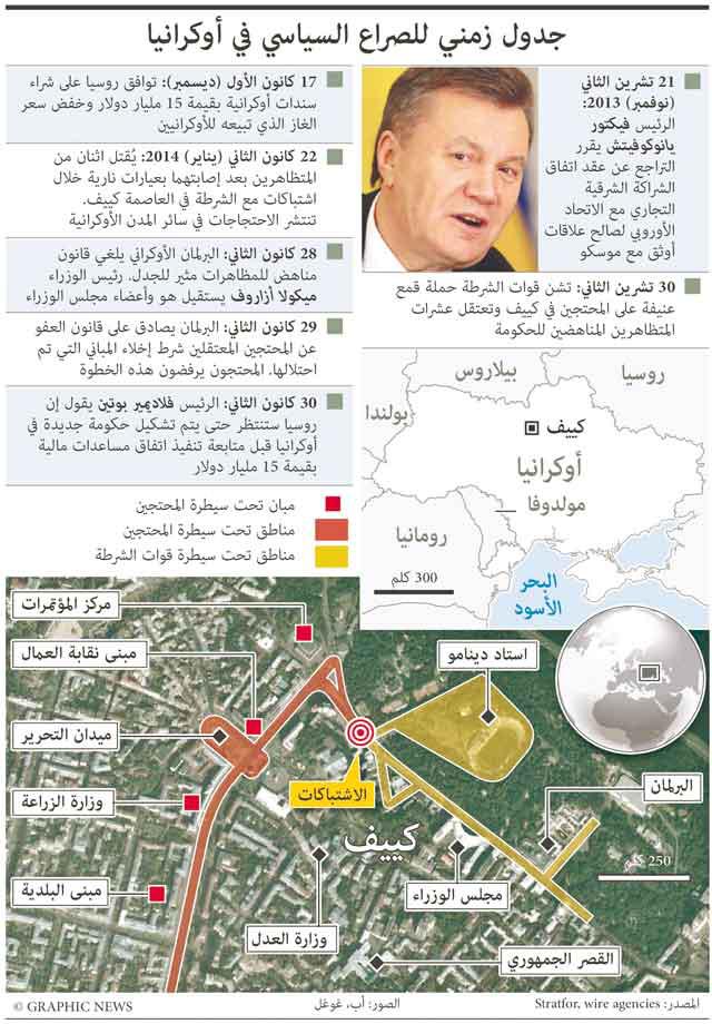 بدت أوكرانيا أمس على أعتاب فراغ سياسي، بعد أن ذهب الرئيس الموالي لروسيا فيكتور يانوكوفيتش في إجازة مرضية، بينما تستمر الحكومة الحالية في تصريف الأعمال بعد استقالتها، بعد رفض المعارضة المبدئي عرض يانوكوفيتش لها لرئاسة الحكومة. ورفض المتظاهرون المؤيدون للشراكة مع الاتحاد الاوروبي أمس مغادرة الحواجز التي اقيمت في وسط كييف، رغم تنازلات كبيرة قدمها يانوكوفيتش، معلنين انهم ماضون في الاحتجاجات المتمركزة في ميدان الاستقلال وسط العاصمة حتى تنحي يانوكوفيتش عن الرئاسة.