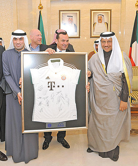 استقبل رئيس مجلس الوزراء سمو الشيخ جابر المبارك، بحضور وزير الاعلام وزير الدولة لشؤون الشباب الشيخ سلمان الحمود، ووزير الدولة لشؤون مجلس الوزراء الشيخ محمد العبدالله في قصر السيف أمس، رئيس نادي الكويت الرياضي عبدالعزيز المرزوق يرافقه رئيس وأعضاء ونجوم نادي بايرن ميونيخ الألماني، وذلك بمناسبة زيارتهم للبلاد للمشاركة في مباراة ودية مع نادي الكويت الرياضي.