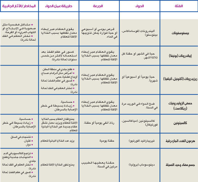 سيوصيك الطبيب على الأرجح بأخذ الدواء في الحالات التالية:• معدل يبلغ ناقص 2.5 أو أقل (هذا هو تعريف هشاشة العظام).• تاريخ في كسور الورك أو العمود الفقري بسبب حادثة سقوط أثناء الوقوف (على عكس حوادث السقوط من علو مرتفع).• يتراوح المعدل بين ناقص 1 وناقص 2.5، ويرتفع خطر الإصابة بكسور في الورك أو في مناطق أخرى مرتبطة بهشاشة العظام خلال السنوات العشر اللاحقة وفق مقياس احتساب خطر الكسور.نقطة البدايةلإبطاء تفكك العظام، يلجأ عدد من الأطباء في البداية إلى فئة معينة من الأدوية. يقول د. ديفيد سلوفيك، أستاذ طب في كلية هارفارد الطبية واختصاصي غدد صماء في مستشفى ماساتشوستس العام: {إذا سجل الفرد معدلاً منخفضاً جداً، نبدأ في العادة بوصف البيسفوسفونات}.تتعدد أنواع البيسفوسفونات التي يمكن الاختيار منها:• أقراص مثل أليندرونات (فوساماكس)، أو إيباندرونات (بونيفا)، أو ريزيدرونات (أكتونيل، أتيلفيا)، على أن تُؤخَذ بشكل يومي أو أسبوعي أو شهري.• حقن الإيباندرونات (بونيفا) مرة كل ثلاثة أشهر.• ضخ حمض الزوليدرونيك (ريكلاست) في الوريد مرة في السنة. يوضح د. سلوفيك: {أفضّل أن أبدأ بوصف الأليندرونات لأنه الأقدم بين جميع الأنواع ولطالما كان تفاعله العلاجي جيداً. كذلك يتوافر على شكل نسخة عامة، وبالتالي يمكن توفير المال على المرضى}.قد يفكر الطبيب أيضاً بتحديد منطقة فقدان العظام. تبين أن أدوية الأليندرونات والريزيدرونات والإيباندرونات تسهم في تخفيض خطر الكسور في العمود الفقري. بالنسبة إلى كل امرأة لديها تاريخ في كسور الورك أو أي مواقع لا ترتبط بالعمود الفقري، يُعتبر نوعا الأليندرونات والريزيدرونات أفضل من الإيباندرونات.إذا كنت مصابة بمشاكل في الجهاز الهضمي مثل الارتداد المعوي أو إذا كنت تعجزين عن الجلوس أو الوقوف بشكل مستقيم طوال 30 أو 60 دقيقة بعد أخذ حبة من البيسفوسفونات، قد يوصيك الطبيب بأخذ حقنة أو ضخ هذه الأدوية في الوريد، علماً أنها فاعلة بقدر الأقراص التي تُؤخَذ عبر الفم.ربما قرأت يوماً عن المخاطر المرتبطة بأدوية البيسفوسفونات (لا سيما الكسور في عظم الفخذ وتنخر العظم في الفك). هذه المخاوف حقيقية لكنها أكثر شيوعاً عند الأشخاص الذين يأخذون البيسفوسفونات في الوريد لمعالجة السرطان الذي يمتد إلى العظام، أو في حالة النساء اللواتي يأخذن جرعة مرتفعة من البيسفوسفونات لفترة طويلة.يدرك الأطباء أن مخاطر هذه الآثار الجانبية تزيد عند استعمال البيسفوسفونات على المدى الطويل، لذا يأخذ معظم النساء هذه الأدوية طوال خمس سنوات تقريباً. النبأ السار أن المنافع تستمر حتى بعد التوقف عن أخذ البيسفوسفونات.خيارات أخرىبالنسبة إلى المرأة التي لا تبدأ بأخذ البيسفوسفونات بعد انقطاع الطمث أو تلك التي تأخذه أصلاً منذ فترة تتراوح بين سنة وخمس سنوات، تتوافر خيارات أخرى.دواء رالوكسيفين (إيفيستا) منظّم مستقبلات الأستروجين الانتقائية، ومعروف على الأرجح بدوره في الوقاية من سرطان الثدي ومعالجته، لكنه يقوم بمهمة مزدوجة ويعالج هشاشة العظام أيضاً. يعمل عبر الاتصال بمستقبلات الأستروجين في أنحاء الجسم لإنتاج آثار تشبه مفاعيل الأستروجين مثل تخفيف مشكلة دوران العظام. يوضح د. سلوفيك: «بالنسبة إلى المصابين بهشاشة العظام في العمود الفقري، يخفّض الرالوكسيفين خطر الكسور في هذه المنطقة». تشمل أبرز الآثار الجانبية: هبّات ساخنة، ألم عضلي، ارتفاع خطر تخثر الدم في الساق.* دواء تيريباراتيد (فورتيو) نسخة مركّبة من هرمون الغدد الجاردرقية الذي يزيد كثافة العظام وقوتها. يمكن أن يخفف خطر الكسور في العمود الفقري وفي عظام أخرى بنسبة ملحوظة. يقول د. سلوفيك: {في حال كانت كثافة العظام منخفضة جداً وتم رصد كسور في العمود الفقري، أوصي عموماً بدواء التيريباراتيد}. يحصر الأطباء في العادة علاج التيريباراتيد بمدة سنتين لأنه لم يخضع لاختبارات تفوق هذه المدة. بعد سنتين، قد يحولك الطبيب إلى نوع من البيسفوسفونات للحفاظ على كثافة عظامك. المرأة التي تأخذ ا