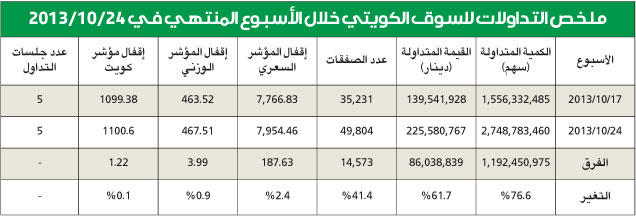ينتظر السوق الكويتي الأسبوع المقبل، حيث استمرار تدفق بيانات الشركات للربع الثالث، التي أعلن منها 4 شركات قيادية حتى الآن، حيث ينتظر أن تبدأ عمليات شراء استثمارية على الأسهم القيادية طبقا لتقديرات التوزيعات السنوية ووفقا لنمو الأرباح الفصلية.