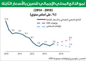 قال تقرير مجموعة QNB الأسبوعي إنه بدلاً من الهبوط العنيف الذي كان يخشاه الكثيرون خلال عام 2012 وأوائل عام 2013، يبدو أن الاقتصاد الصيني مقبل على الانطلاق مجدداً بحسب المؤشرات التي ظهرت مؤخراً. وقد اتخذت السلطات الصينية تدابير بأوائل هذا العام للحد من بعض المخاطر، بما في ذلك مخاطر الزيادة المفرطة في الائتمان.وبعد الإعلان الذي صدر في الآونة الأخيرة عن حزمة من الإصلاحات الكبرى، بالإضافة إلى الأخبار الاقتصادية الإيجابية، فمن المتوقع وفقاً لتحليلات مجموعة QNB أن ينمو الاقتصاد الصيني بنسبة 8.0%- 8.5% خلال عام 2014. ويعزى ذلك للتحول المستمر في الاقتصاد الصيني من اقتصاد يعتمد على الصادرات إلى آخر مبني على الاستهلاك.