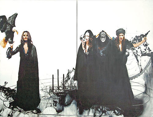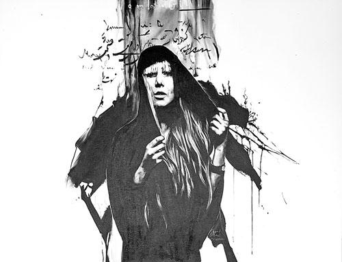 لا ضير في أن نقول إن أعمال الفنان الإيراني مرعبة، خصوصاً حين يحضر النسر رمز القوة والعنف بين الطيور، وحين يحضر السيف وما يحمل من دلالات وإشارات سلطوية وعنفية ومشهدية، وحتى نظرات النساء تقوم على التحدي والقوة والخطيئة والحرية.جموح وتحدلا يمكن لمشاهد أعمال آفشين بيرهاشيمي أن ينسى نظرات نسائه العنيفة والجامحة والمتحدية، ربما ركز الفنان على النظرات كي تبقى في الذاكرة، كأن ما هو جامع بين اللوحات ليس السواد والنساء فحسب، بل نظراتهن خصوصاً، ولا يمكن للمرء أن ينسى وجوده أمام حضور تلك الشخصية ذات الرداء الأسود التي تعكس حالة من التصدع والتفكك، وتظهر شخصيتها قوية أكثر من أي وقت مضى، اذ يختار بيرهاشيمي أن يصور في لوحاته نساء تعرضن للظلم والإجحاف الاجتماعي والسياسي.في هذه السلسلة، تظهر النساء محجبات جزئياً، أو حتى مرتديات عباءات وسافرات الوجوه وأحيانا الشعر، ولكن، في الوقت نفسه، يظهرن معلنات حبهن للولايات المتحدة الأميركية، في إشارة من الفنان هنا إلى الانقسام في الهوية المحسوس بشكل يومي في إيران، وهذا ما تشتهر به المرأة الإيرانية في العصر الحديث، إذ تتماشى مع الغرب وموضته وعصريته، وفي الوقت نفسه ترتبط بشكل صميمي مع هويتها الأصلية من خلال اللباس والمرغوب الاجتماعي في المجال الأسري الذي فرضته الثورة الخمينية منذ أكثر من ثلاثة عقود. رموز وتمزقبين الرموز الغربية والرموز الإيرانية تتمزق التابوهات وتتشكل اللوحة التي تقول لغتها الخاصة، وتمارس غواياتها على العابر وعاشق الفن. الأرجح أننا أمام لعبة الفصام التي أفرزتها الحداثة بين إغواء الدين والغيب وإغواء الموضة والحرية، وبين هذه وتلك يكون التصدع والانقسام والغموض والضبابية... فغواية الدين لا تقلّ قوة عن غواية الغرب والموضة.تظهر أعمال آفشين بيرهاشيمي التعقيدات التي تتخلل نمط الحياة المعاصرة في إيران، كذلك تظهر أعماله الفنية، سواء كانت على خلفيات ضئيلة أو حتى فارغة، وفي لوحاته أحادية اللون التي تحوي صوراً واقعية، إيماءة النساء نحو الخيال القوطي من خلال استكشاف القضايا الاجتماعية المعاصرة والهوية السياسية.مشاعر تصاعديةتتميز أعمال الفنان القماشية بتفاصيل غنية تتضمن مرجعيات تاريخية غربية وشرقية، وفي واحدة من تلك الأعمال الجديدة والمؤثرة، يحاول الفنان أن يغلف كل من التاريخ والجغرافيا عبر إدراج الاسطرلاب الإسلامي، في أشارة منه إلى منظر عالم النفس سيغموند فرويد والشاعر الصوفي جلال الدين الرومي الذي بات رمزاً في الأعمال الرواية والفنية والشعبية والسينمائية.وجاء في بيان غاليري {أيام} أن الفنان يضع ضمن مشهد تنسيقي مهني مشاهديه في مواجهة طائفة من النساء اجتمعن سوية في محاولات لابتكار نظام عالمي جديد، فبعضهن يخفي هويته من خلال ارتداء أقنعة دالة على {الصراخ» أو أقنعة كرنفالية، بينما تستعرض أخريات ضربات السيوف. وتظهر قوة النساء بشكل متفاوت ومتسارع مقارنة بالذئاب التي تجول وراءها في خلفية اللوحة. هي لعبة الإغواء في مختلف مجالاتها بين المباشرة والأقنعة والدم والشهوانية والقتل والنظرات، كلها ملامح تجمع بين الفن والسينما، بين الكاميرا واللون، بين التورية والمباشرة، بين السواد ولغة السواد.تجاوزت الكثافة المقترحة في أعمال بيرهاشيمي القماشية الجديدة أعماله السابقة أحادية اللون من حيث قدرتها على إفراز المشاعر التصاعدية، وعلى صعيد أعمق، فإن ادخال الألوان مثل الكستنائي والنحاسي متخللا شعر شخصياته الهالكة، وتضمين النسر باعتباره رمزاً للعنف، كل ذلك يضفي على الأعمال الشراسة والدم والشهوانية والعنفوان والقوة، وهذا يتناقض مع المرضية والهلال للون الأسود الذي عادة ما ترتديه النساء.