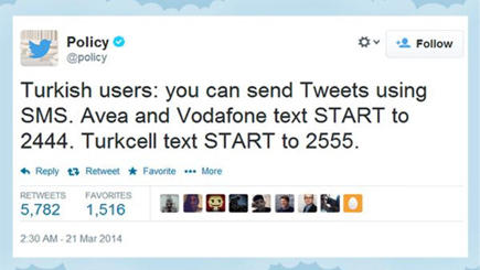 بعد ساعات قليلة بعد قرار رجب طيب أردوغان بإغلاق "تويتر" في تركيا سعياً منه لتوقيف حملة المعارضة التي تنشر فضائح حكومته، تحركت إدارة موقع "تويتر" وأرشدت المغردين في عموم تركيا إلى طريقة تمكّنهم من الاستمرار في نشر التغريدات عن طريق الرسائل النصية القصيرة. ويبلغ عدد مستخدمي "تويتر" في تركيا أكثر من 10 ملايين مستخدم مسجّل، من بينهم الرئيس التركي عبدالله غول وعدد من كبار المسؤولين في الحكومة التركية.