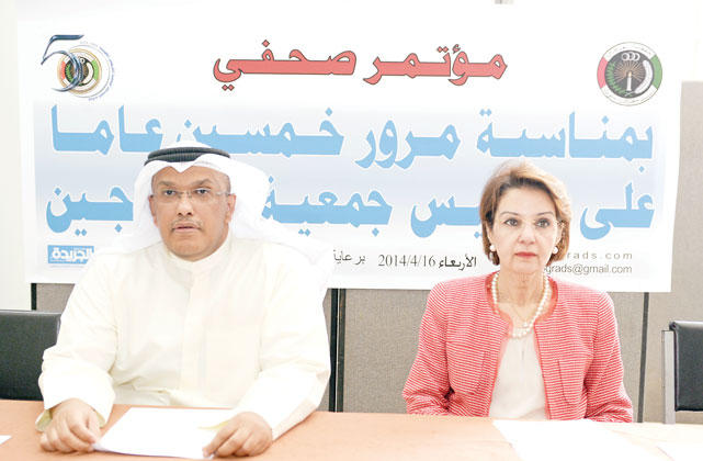 أكد نائب رئيس جمعية الخريجين الكويتية إبراهيم المليفي أن الجمعية ستبدأ الأحد المقبل فعاليات احتفالها بمرور 50 عاما على تأسيسها، لافتا الى ان الاحتفال الذي ستستمر فعالياته مدة عام سيبدأ بتكريم اعضاء نادي الخريجين وأعضاء مجلس الادارات السابقة.وقال المليفي، في مؤتمر صحافي عقد أمس بمقر الجمعية، بحضور امين السر مها البرجس، "سيقام مؤتمر وطني، يومي الاثنين والثلاثاء المقبلين، حول واقع الخريجين وتوظيفهم، وستكون جلسة اليوم الاول بعنوان "الخريج... احلام المستقبل وأوهام الواقع"، ويشارك فيها مدير الجامعة العربية المفتوحة د. موضي الحمود، ورئيس الصفحة الاقتصادية في جريدة الجريدة الزميل محمد البغلي، ومديرة برنامج الحوكمة الديمقراطية في برنامج الامم المتحدة الانمائي هدى الدخيل".