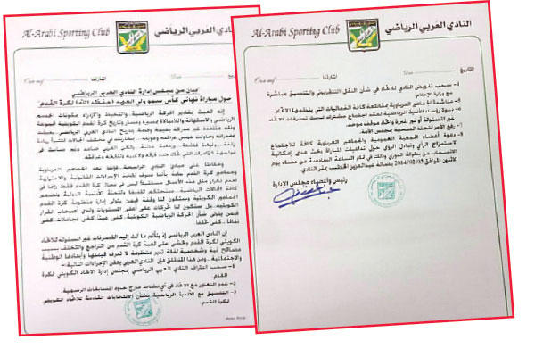 أصدر مجلس إدارة النادي العربي بيانا حدد فيه الخطوات التي ينوي اتخاذها تجاه الاتحاد الكويتي لكرة القدم في المستقبل القريب، وذلك على خلفية الأحداث التي صاحبت المباراة النهائية لبطولة كأس سمو ولي العهد، والتي خسرها الأخضر بعد قرارات تحكيمية خاطئة ارتكبها الحكم مبارك الشعيب. ووصف مجلس إدارة العربي في بيانه ما حدث "بأنه العبث بمقادير الحركة الرياضية والتخبط والازدراء بمكونات الجسم الرياضي"، واتهم البيان "مجموعة وفئة متنفذة" بالاستهانة واللامبالاة بمسيرة ومسار وتاريخ كرة القدم الكويتية غير مدركة بقيمة وقامة وتاريخ النادي العربي الرياضي للعبث بمقدراته، وحاولت طمس عراقته وهويته بمحاربته في مختلف المجالات، لتتبوأ ريادة زائفة وقيادة فاشلة وزعامة خائبة".