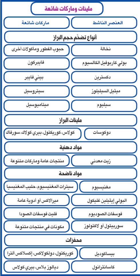 ملينات تضخّم حجم البرازيسحب هذا النوع من الملينات الماء نحو البراز ويجعله أكثر ليونة كي يمر بالأمعاء بسهولة. لكن لا تتوقع نتيجة فورية: تحتاج هذه الأنواع إلى نصف يوم أو أيام عدة كي توفر الراحة المنشودة. يمكن استعمالها يومياً من دون مشكلة. هي تحتوي على مكونات متنوعة وقد تضطر إلى استعمال أكثر من نوع حتى إيجاد المنتج الذي يساعدك مع أقل آثار جانبية ممكنة، مثل الغازات والنفخة. يمكن تسويق هذه المنتجات كملينات للأمعاء أو مكملات الألياف.تعزز الملينات رطوبة البراز، ما يجعله أكثر ليونة ويسهّل مروره. يساعد الزيت المعدني البراز على {الانزلاق} إذا علق في الأمعاء، أو عند الإصابة بتمزق داخلي أو الشعور بألم بسبب البواسير خلال تفريغ الأمعاء. لا تأخذ أي زيت معدني تزامناً مع ملينات البراز. بل خذ ملعقة كبيرة منه على الفطور أو الغداء. لكن لا تستعمله لأكثر من بضعة أيام لأن الزيت المعدني يؤثر على امتصاص بعض الفيتامينات، وقد يسبب التهاباً رئوياً عند تنشّقه. فكر باستعمال فوطة واقية على الملابس الداخلية لامتصاص أي تسرب.خيارات أخرى إذا لم تنجح الأنواع التقليدية، توصي د. وولف بالملينات الناضحة مثل {ميرالاكس} أو أي أدوية عامة. هذه الأنواع تحبس الماء في البراز لتليينه وتنشّط حركة الأمعاء. تشمل الآثار الجانبية الشائعة: الغازات والنفخة والغثيان. ثمة خيار آخر يفيد بعض الناس وهو يقضي باستهلاك السكاكر الخالية من السكر كونها تحتوي على المادة المُحَلّية {سوربيتول}. هذه المواد تسبب حالة خفيفة من الإسهال. لكنك قد تختبر أعراض مثل النفخة والغازات إلى جانب تليين المعدة في هذه الحالة.يقضي خيار آخر باستعمال ملينات غنية بالمغنيسيوم مثل حليب المغنيسيا أو سيترات المغنيسيوم. تنتمي هذه الأنواع إلى فئة أكبر من الملينات الناضحة والمالحة وهي تسحب الماء نحو الأمعاء وتحرّكها. تشمل المكونات الناشطة المغنيسيوم والكبريتات والسيترات والفوسفات. لكن لا تأخذ كمية مفرطة من هذه الملينات ولا تستعملها على المدى الطويل لأنها قد تؤدي إلى اختلال تركيبة الجسم الكيماوية. إذا اجتمعت الملينات الناضحة مع ضعف وظيفة الكلى أو قصور القلب، قد تصبح خطيرة.ملينات محفّزةتسبب الملينات المحفزة، مثل {بيساكوديل} و{كاسكارا}، انقباضات في الأمعاء وهي تدفع البراز. توضح د. وولف: {حين تكون حركة الأمعاء بطيئة، يحتاج البعض إلى ملينات محفّزة}. لكن إذا كنت تأخذ الملينات المحفزة في مناسبات كثيرة، قد تعتاد عليها وتصبح حركة الأمعاء مرتبطة بها، لأن الأمعاء لا تعود تعمل بشكل طبيعي.متى يجب اللجوء إلى الطبيب؟إذا بدأتَ تجرّب الملينات تلو الأخرى لفترات طويلة، اقصد الطبيب لتقييم حالتك. قد يؤدي بعض الفحوصات الإضافية إلى الخضوع لعلاج أفضل وتجنب أي اختلالات خطيرة. تضيف د. وولف: {إذا كانت المشكلة تقتصر على الإمساك، يمكن أن يصف لك الطبيب أدوية أخرى قد تفيدك أكثر من الملينات التي تباع من دون وصفة طبية}.