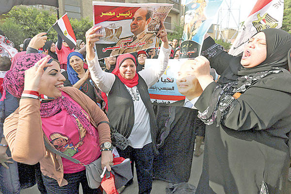 وقرب نهاية الطابور كانت فتيات يرسمن مشهدا آخر يكشف مناصرة السيسي بطريقة مبتكرة، فقد ارتدين ملابس تجمع ألوان علم مصر، وثبتت إحداهن على قميصها صورة لـ"الرجل الأقدر على حماية مصر"، على حد قولها. وبدت هذه المشاهد كأنها مرتبة وصعب تكرارها في لجان أخرى، لكن على غير المتوقع فوجئ المصريون بآلاف الصور التي تم حصر عدد كبير منها على الصفحة الرسمية لحملة "تحيا مصر" الداعمة للسيسي، جميعها تصور نساء وفتيات عبرن فيها عن تأييد مرشحهن بطرق متشابهة، فبخلاف ارتداء الكثير منهن لملابس على هيئة علم مصر، تكرر مشهد الأصابع العشرة المغموسة في الحبر الفسفوري، بينما الحركة الأشهر كانت ابتكار علامة "C" بإصبعي السبابة والإبهام، في إشارة للحرف الأول من كلمة "سيسي" باللغة الإنكليزية.وقالت الطالبة الجامعية أميرة عبدالله إن هذه العلامة ظهرت بين أنصار المشير السيسي في أعقاب فض اعتصام "الإخوان" في ساحة "رابعة العدوية"، 14 أغسطس العام الماضي، كرد على شارة "رابعة" التي يبسط فيها الإخوانيون أصابعهم الأربعة تأييدا لرئيسهم المعزول. الصور التي أمطرت موقع "فيسبوك" منذ الساعات الأولى لانطلاق السباق الرئاسي، تضمنت ابتكارات أخرى، من بينها كتابة فتاة على كفها عبارة "تحيا مصر" وهي شعار حملة السيسي، بينما رسمت أخرى "بورتريه" له بألوان الفحم واصطحبته معها أثناء التصويت.أما الصورة الأكثر تداولا فبطلتها فتاة أخرجت لسانها نكاية في "الإخوان" ولوّحت بعلامة "C"، وثبتت على قميصها ثلاث صور للرئيس الأسبق حسني مبارك، والمرشح الرئاسي السابق أحمد شفيق، والمشير السيسي.