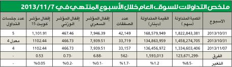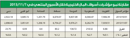 انتهت تعاملات الاسبوع الاول من شهر نوفمبر بسيطرة اللون الاخضر على مؤشرات معظم الاسواق الخليجية كمحصلة اسبوعية حيث ربحت خمسة مؤشرات وتراجع مؤشران فقط بنسب محدودة دون 1 في المئة هما دبي والكويتي، بينما كانت القيادة للسوق الاكبر عربيا وهو السعودي الذي ربح 2.7 في المئة معززا حضوره فوق مستوى 8 آلاف نقطة تلاه سوقا قطر ومسقط بمكاسب تجاوزت 1 في المئة ثم سوقا ابوظبي والمنامة بمكاسب محدودة دون نصف نقطة مئوية.السعودي بالصدارةسحب مؤشر السوق السعودي البساط من مؤشر دبي هذا الأسبوع بعد أن أنهي الأسبوع الاول من هذا الشهر على مكاسب كبيرة بلغت 2.7 في المئة ليبلغ اعلى مستوياته منذ الازمة المالية العالمية عام 2008 حيث نجح بالاستقرار على مستوى 8200 نقطة وعلى مستوى 8262.79 نقطة بعد أن اضاف 218.32 نقطة وبدعم من تداولات الاسهم القيادية سابك والراجحي وسهم الاتصالات الذي بلغ ارتفاعه 38 في المئة منذ بداية هذا العام ليحلق بالمؤشر السعودي الى مكاسب بلغت 21 في المئة هذا العام.وجاء دعم الاسهم القيادية من خلال مكاسب مؤشر السوق الاميركي داو جونز الذي بلغ مستويات قياسية هذا الاسبوع قابله استقرار لاسعار النفط عالميا، بينما محليا دعمت اعلانات الشركات للربع الثالث اداء الاسهم حيث سجل معظمها نموا جيدا مما جعلها اهدافا استثمارية.الدوحة ومسقط سجل مؤشرا سوقي الدوحة ومسقط مكاسب متقاربة وكانا وسطا بين الرابحين حيث اقترب الاول من مستوى 10 آلاف نقطة مجددا واقفل عند مستوى 9976.21 نقطة بعد مكاسب بلغت 1.4 في المئة تعادل 138.72 نقطة مستمرا بالصعود للاسبوع الثاني على التوالي بينما كانت مكاسب مسقط اقل بقليل بنسبة 1.2 في المئة وتعادل 80.2 نقطة ليقفل عند مستوى 6754.27 نقطة وكانت تعاملات الاسواق العالمية الايجابية وتفاؤل نمو الاقتصاد العالمي اكبر الداعمين لمسيرة اسواق المنطقة بشكل عام وسوقي مسقط والدوحة بشكل خاص.مكاسب في أبوظبي والمنامةاستقر مؤشر سوق المنامة عند مستوى 1200 نقطة بعد مكاسب محدودة حققها خلال الاسبوع الحالي بلغت 0.4 في المئة تعادل 4.4 نقاط ليقفل عند مستوى 1206.19 نقطة مستفيدا من نموا اسعار اسهم قطاع المصارف بعد نتائج ايجابية للشركات المعلنة والتي كان ابرزها اهلي متحد بنسبة نمو كبيرة بلغت 90 في المئة.وكان مؤشر سوق ابوظبي الادنى من حيث المكاسب وبنسبة عشري نقطة مئوية تعادل 6.09 نقاط ليقفل عند مستوى 3851.81 نقطة حيث ضغطت نتائج قطاعي الاتصالات والطاقة على المؤشرات حيث حققت نموا سلبيا خلال الربع الثالث وكانت نسبة تراجع ارباح اسهم الطاقة اكبر سهمي دانة وطاقة الذي تراجعت ارباحه بنسبة 88 في المئة.خسائر محدودةكانت الخسائر من نصيب سوقي دبي والكويت خلال هذا الاسبوع حيث تراجع دبي بنسبة 0.8 في المئة بعد عمليات جني ارباح حيث كان السوق الاكثر ارتفاعا وفي مقدمة الاسواق العالمية بنمو تجاوز 75 في المئة خلال هذا العام، وفقد سوق دبي 23.75 نقطة ليتراجع الى مستوى 2898.43 نقطة.واستقرت مؤشرات السوق الكويتي الرئيسية حيث انخفض المؤشر السعري بنسبة محدودة جدا لم تتجاوز عشر نقطة مئوية أي 6.88 نقطة ليقفل عند مستوى 7939.51 نقطة حيث كان التغير الاكبر خلال جلسة السوق الاولى لهذا الشهر والتي تصادف موعدها بعد اعلان استجواب رئيس مجلس الوزراء ولكن لحقها جلسات ثلاث استطاعت استعادة الخسائر بشكل هادئ، وخسر كذلك مؤشر السوق الوزني عشري نقطة مئوية تعادل 0.73 نقطة ليقفل عند مستوى 466.73 نقطة، واستقر مؤشر كويت 15 عند نقطة اقفاله مائلا الى المنطقة الخضراء وبمكاسب محدودة جدا بلغت نسبتها 0.05 في المئة فقط اي نصف نقطة ليقفل عند مستوى 1102.44 نقطة.واستقرت كذلك معدلات النشاط والسيولة حيث كان عدد الجلسات 4 مقابل 5 في الاسبوع الاسبق بسبب عطلة رأس السنة الهجرية وكان التراجع بنسبة 8.5 في المئة فقط بينما ارتفعت السيولة بشكل محدود وبنسبة 1.2 في المئة فقط وتراجع عدد الصفقات بنسبة مقاربة، وسيطرت اعلانات ارباح بعض الشركات على اتجاه اسعارها وكان معظمها ايجابا وبانتظار بقية الاعلانات حيث ستحدد نسبة التحسن في مؤشر