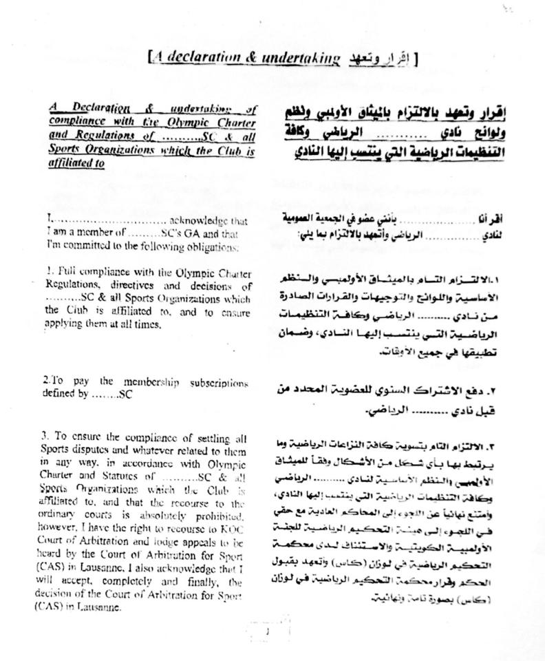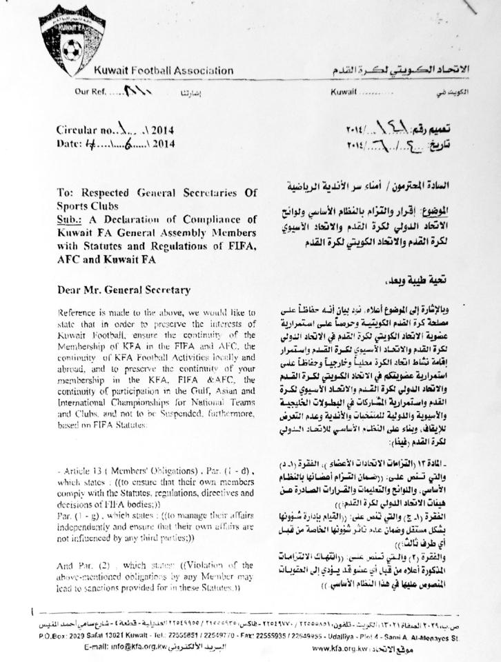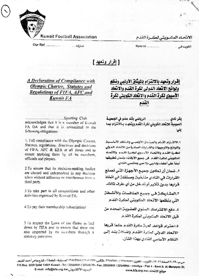 فيوم أمس الأول، وفي خطوة مفاجئة ودون مقدمات، أرسل الاتحاد الكويتي لكرة القدم كتاباً موجهاً إلى الأندية الرياضية، بضرورة موافاته بإقرار وتعهد بالالتزام بالنظام الأساسي، ولوائح الاتحاد الدولي لكرة القدم، والاتحاد الآسيوي، وكذلك الاتحاد الكويتي!التذرع بمصلحة الكرة الكويتيةوأشار كتاب الاتحاد إلى الأندية، والذي يعد تفويضاً ملزماً منها لاتحاد الكرة، كما سيتضح لاحقاً، بما يراه مناسباً لمصلحته حتى لو كانت على حساب الأندية، وجمعياتها العمومية التي يريد الاتحاد نزع جميع صلاحياتها، وتحويلها إلى بصامة كما هي العادة، لمن يريد أن يتعامل مع الاتحاد وينطوي تحت جناحه.وكعادته التي لا تنقطع، يدّعي الاتحاد في كتابه أن خطوته هذه تأتي حفاظاً على مصلحة الكرة الكويتية، وحرصاً على استمرارية عضوية الاتحاد الكويتي لكرة القدم في الاتحادين الدولي والآسيوي، واستمرار نشاط اتحاد الكرة محلياً وخارجياً وحفاظاً على عضوية النادي المعني في الاتحاد الكويتي لكرة القدم، وعدم التعرض للإيقاف وإلخ إلخ...!نسف المادة 28 من قانون 26وحسب المواد الكثيرة التي ذكرها الاتحاد كالمادتين 13، 14 والفقرات التي ذكرها، والتي حملت ترغيباً وترهيباً ووعيداً للأندية في حال لم تستجب لقرارات الاتحاد، أو بالأحرى أوامره إلى مجالس الإدارة والجمعيات العمومية، حيث طلب منها وجمعياتها العمومية تقديم إقرار وتعهد تم دس السم بالعسل في أغلب أجزائه، فهو ينطوي على بند ينسف كل ما يتعلق بالمادة 28 من القانون 26 لسنة 2012، والتي تنص على "تشكيل هيئة تحكيم أو أكثر بمقر المحكمة الكلية للنظر في المنازعات الرياضية تكون برئاسة أحد القضاة بدرجة مستشار على الأقل يصدر بندبه قرار من وزير العدل بناءً على موافقة المجلس الأعلى للقضاء وعضوية اثنين من المحكمين يختار كل من أطراف النزاع أحدهما".وتختص الهيئة بالفصل في المنازعات المتعلقة بالأنشطة الرياضية التي يتفق ذوو الشأن على عرضها عليها، سواء كانت هذه المنازعات بين الهيئات الرياضية أو أي شخص طبيعي أو اعتباري له علاقة بموضوع النزاع. لكن يبدو أن إنشاء هيئة فض نزاعات كويتية في المحكمة الكلية تكون صاحبة الحق في الفصل في القضايا الخلافية في المشاكل الرياضية العالقة في الكويت لا تروق لرئيس اتحاد الكرة! فقد جاء في البند السادس من التعهد الذي من المفروض أن توقع عليه الأندية وأعضاء الجمعيات العمومية "ضرورة الالتزام بتسوية كافة النزاعات الرياضية وما يرتبط بها بأي شكل من الأشكال وفقا للميثاق الأولمبي، والنظام الأساسي لاتحاد الكرة الكويتي، والآسيوي، ويمتنع النادي نهائياً عن المحاكم العادية مع حقه في اللجوء إلى هيئة التحكيم الرياضية الوطنية (NSAT) والاستئناف لدى محكمة التحكيم الرياضية في لوزان كاس، ويتعهد النادي بقبول الحكم وقرار محكمة التحكيم الرياضية بصورة نهائية، كما طالب الاتحاد الكويتي بالالتزام التام بعدم إجراء أي تعديل على النظام الأساسي للنادي من غير موافقة مسبقة من الاتحاد، وعرض النظام الأساسي المعدل في الجمعية العمومية للاتحاد الكويتي لكرة القدم لاعتماده قبل إرساله إلى الاتحاد الدولي فيفا لاعتماده!وهو ما يعني أن الجمعية العمومية لاتحاد الكرة التي يهيمن عليها الشيخ طلال الفهد ستكون متحكمة في كل شاردة وواردة للجمعيات العمومية، والتي لن تستطيع أن تحرك ساكناً من دون نيل رضا الاتحاد أو بالأحرى رضا الفهد.التحكم بأنظمة الأندية الأساسيةوبنظرة سريعة على ما أبرز ما طلبه اتحاد الكرة من الأندية والجمعيات العمومية، وهو ضرورة تزويده بالأنظمة الأساسية للأندية لمراجعتها وتعديلها والحصول على موافقة الاتحاد الدولي عليها قبل العمل بها، كما يجبر الاتحاد الكرة مجالس إدارات الأندية على استدعاء أعضاء الجمعيات العمومية وتوقيعهم على الإقرارات، بل وإجبارهم على التوقيع وإلا فالويل والثبور، والسؤال حول طلب الاتحاد والجهبذ الذي اقترح هذا الاقتراح غير المعقول وغير المسبوق هو كيف لاتحاد خاص بلعبة م
