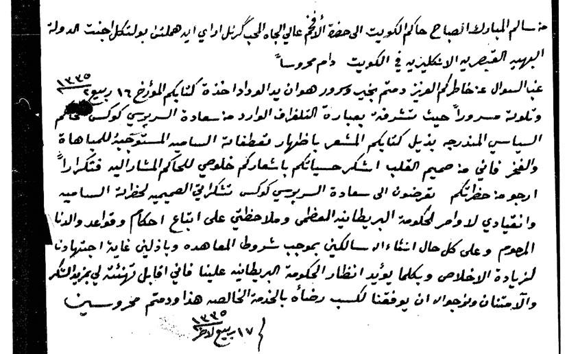 وثيقة لها تاريخ : الشيخ سالم للمعتمد البريطاني:«سالكين بموجب شروط المعاهدة وباذلين غاية اجتهادنا لزيادة الإخلاص»