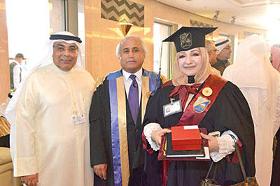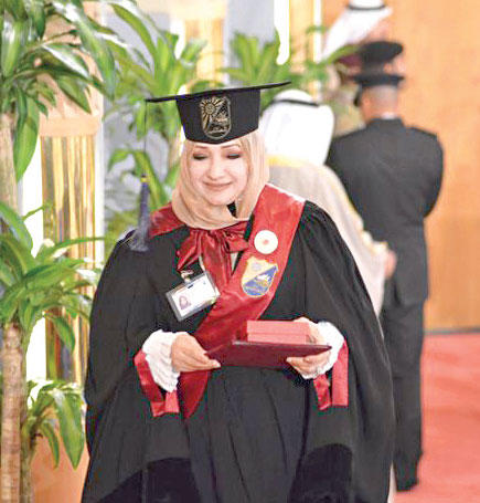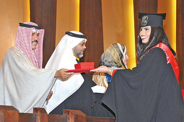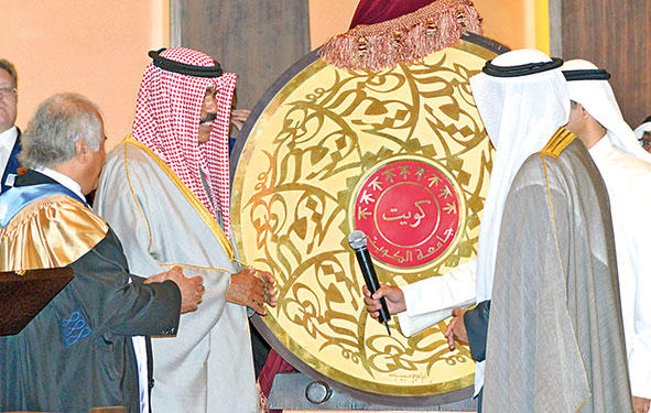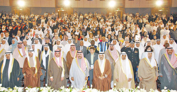 برعاية سمو أمير البلاد الشيخ صباح الأحمد وحضور سمو نائب الأمير ولي العهد الشيخ نواف الأحمد، أقامت جامعة الكويت أمس حفلها السنوي لأوائل الخريجين المتفوقين من الدفعة الثالثة والأربعين للعام الجامعي 2012/2013 وذلك على مسرح الشيخ عبدالله الجابر في الحرم الجامعي بالشويخ.وقال نائب سمو الأمير ولي العهد الشيخ نواف الأحمد، بعد تقديم جامعة الكويت هدية تذكارية إلى سموه، "أفتخر وأعتز بهذا الرمز، وإن شاء الله يرجع لنا صاحب السمو أمير البلاد الشيخ صباح الأحمد إلى أرض الوطن سالماً".