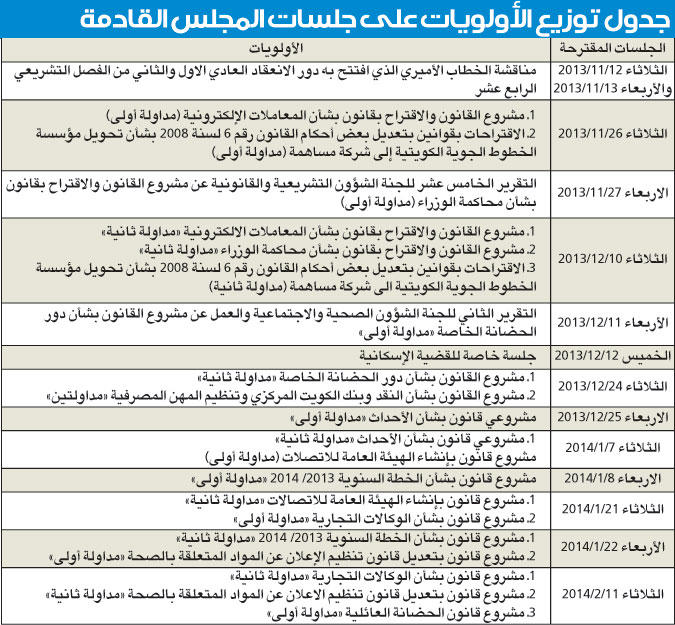 وأوضح العمير ان "ما جاء على رأس الاولويات هي القضايا المرتبطة بجدول زمني معين كتحويل مؤسسة الخطوط الجوية الكويتية الى شركة مساهمة عامة والتي ستكون مداولتها الاولى في 26/11 بالاضافة الى ان المداولة الاولى لقانون المعاملات الالكترونية تم تسليمها، وفي جلسة 27/11 المداولة الاولى لتعديل قانون محاكمة الوزراء". وبين العمير ان القضية الاسكانية ستأتي في جلسة 12/12 ثم تتبعها قوانين الاسكان لاحقا وستتم مناقشتها 18/3/2014 بعد ان تقدم الحكومة منظورها الاسكاني وانقضاء مهلة افساح المجال للحكومة لتقديم هذه القوانين.ولفت العمير الى ان "قانون التجنيد الالزامي وعدم وروده ضمن رأس الاولويات لا يعني عدم تبنيه كاولوية وان ما فهم امس فهم بشكل خاطئ حوله، وتأخير مناقشته الى 30/4/2014 الى ما بعد انتهاء لجنة الداخلية والدفاع البرلمانية من تقريرها حوله وكذلك الانتهاء من الاولويات المقدمة في قانون التجنيد".ولفت العمير الى انه "اخر قانون سيتم تناوله ضمن جدول الاولويات هو قانون السجل التجاري الذي سيكون في مداولته في جلسة 13/5/2014 ومن ثم الانتقال لقوانين الميزانيات"، مشيرا الى ان "هذه الاولويات ومواعيدها تم وضعها بناء على تكليف من مكتب مجلس الامة وبالتالي الفريق سيرفع تقريره له وهو بدوره يقر ما يراه مناسبا بالعرض على مجلس الامة".