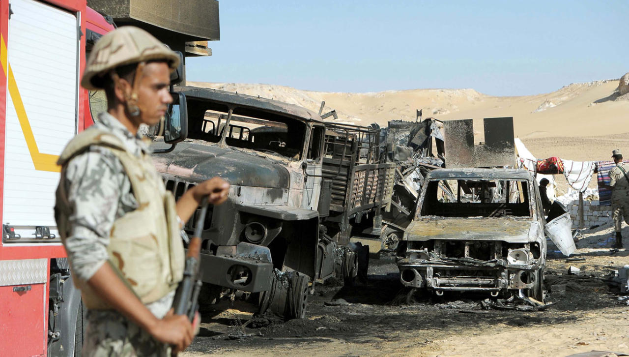 توعد الرئيس المصري عبدالفتاح السيسي بالثأر للجنود الـ22 الذين سقطوا في هجوم مفاجئ على وحدتهم العسكرية، على مشارف واحة الفرافرة، في صحراء مصر الغربية الحدودية مع ليبيا والسودان.وقالت الرئاسة، في بيان أصدرته مساء أمس الأول، بعد اجتماع لمجلس الدفاع الوطني، الذي يختص باتخاذ القرارات الاستراتيجية، إن "أرواح أولئك الشهداء ودماءهم الزكية التي سالت على تراب هذا الوطن سيكون لها قصاصها، وسيتم اجتثاث الإرهاب من كل أراضيه وربوعه، وسيلقى القائمون عليه والخارجون على القانون جزاءهم". وفور وقوع الهجوم على المجموعة التابعة لقوات حرس الحدود قبيل الإفطار، والذي أسفر عن مقتل 22 جندياً وإصابة 3 آخرين، بدأت المروحيات العسكرية تمشيط الدروب الصحراوية المؤدية إلى الحدود الليبية غرباً والسودانية جنوباً، حيث إن الحاجز الأمني الذي تعرض للهجوم يقع قرب مفارق عدة طرق على مشارف واحة الفرافرة.وأفادت معلومات أولية بأن التخطيط لهذه العملية تم في مدينة درنة الليبية، حيث مقر تنظيم "أنصار الشريعة"، التابع لشبكة "القاعدة"، والذي يرتبط بعلاقات تحالف وثيق مع جماعة "أنصار بيت المقدس" التي تنشط في سيناء.ويعد هذا الهجوم الأسوأ الذي تتعرض فيه وحدات عسكرية مصرية لهجمات إرهابية بعد إطاحة الرئيس الإخواني محمد مرسي.وقال الناجون من الحادث إن المهاجمين الذين يصل عددهم إلى 20 باغتوا الجنود بإطلاق قذائف مدفعية ورشاشات ثقيلة، ما أدى إلى انفجار مخزن الذخيرة التابع للوحدة، مؤكدين أن قائد الوحدة العسكرية ومساعديه قاتلوا دفاعاً عن أنفسهم، وأسقطوا بالفعل أربعة قتلى في صفوف الإرهابيين.
