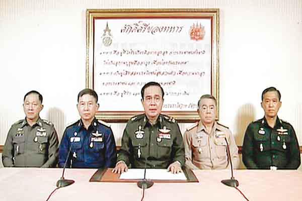 بعد سبعة أشهر من الاحتجاجات السياسية الدموية في بانكوك، أعلن الجيش التايلندي أمس انقلاباً عسكرياً وعلق العمل بالدستور.وفي تصريح تلفزيوني، قال قائد سلاح البر الجنرال برايوت تشان أو تشا: "كي تعود البلاد إلى الحياة الطبيعية، على القوات المسلحة أن تتسلم السلطة اعتباراً من 22 مايو (أمس)".