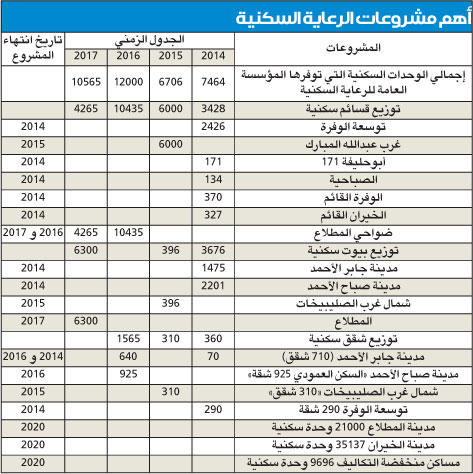 وحدات سكنية وستطرح الحكومة خلال جلسة اليوم أهم المشاريع الاسكانية الجديدة التي ستدعم رؤيتها، ويصل اجمالي الوحدات السكنية التي ستنجز منذ السنة المالية الحالية حتى 2017 إلى 36.735 وحدة، ستوزع منها 3428 وحدة في 2014، و6 الاف في 2015، و10435 في 2016، و4265 في 2017. وأول المشاريع التي ستنجز هي مشروع الوفرة الجديد الذي سيحوي 2426 وحدة، والمشروع الثاني في غرب عبدالله المبارك، ويحوي 6 آلاف وحدة في 2015، بينما سينجز في 2014 ستة مشاريع اسكانية تتمثل في ابوحليفة والوفرة والخيران وجابر الأحمد وصباح الاحمد بواقع 4687 وحدة. وسيتم توزيع شقق سكنية بواقع 360 شقة في 2014، و310 في 2015، و1565 في 2016، كما ستحوي منطقة صباح الاحمد انجاز 710 شقق سكنية ما بين عامي 2014 و2016. أما البناء العمودي الذي سيكون في مدينة صباح الاحمد فسيشمل 925 شقة سكنية تنجز في 2016، بينما ستنجز هيئة الرعاية السكنية 310 شقق في 2015 غربي الصليبيخات، و290 شقة في الوفرة. قسائم خاصة وذكر التصور الحكومي ان اجمالي الطلبات المتوقعة للقروض الاسكانية ستصل الى 8396 قرضا حتى عام 2017، بواقع 3696 قرضا في 2014، و1577 في 2015، و1549 في 2016، و1571 في 2017، وستشمل هذه القروض بناء قسائم خاصة وشراء بيوت جاهزة وشقق وتوسعة وترميم بيوت حكومية وقروض مطلقات وارامل وقروض لبيوت خرسانية. وبشأن شركات المدن الإسكانية فستتمثل في مدينة المطلاع التي ستشتمل على 21 الف وحدة سكنية، على ان يبدأ توزيع القسائم على المخططات في 2017، وينجز المشروع في 2020، اما الشركة الاخرى فستكون لمدينة الخيران، وتشمل 35137 وحدة، وستنجز عام 2020، أما شركة المساكن منخفضة التكاليف فستنجز 9696 وحدة سكنية في 2020. وتابع المنظور ان المشاريع الاسكانية ستتضمن تطوير البنى التحتية لمناطق الاسكان العام، لافتا الى ان المنظور الاسكاني الجديد سيتضمن استحداث آليات تمويل اسكاني طويلة الاجل، من خلال القروض التجارية التي تتراوح بين 25 و30 سنة، على ان يتم خلال تعديل لوائح بنك التسليف بشأن الرهن العقاري في 2016. الكندري: تطبيق الرقابة كان وراء تعثر الدورة المستندية استغرب النائب فيصل الكندري الهجوم على الغاء الرقابة المسبقة من المشاريع الاسكانية مبينا انه ورد في قانون ديوان المحاسبة. وقال الكندري في تصريح للصحافيين ان "تطبيق الرقابة كان وراء تعثر الدورة المستندية لابرام العقود بالديوان والجهات الرقابة الاخرى" موضحا ان هناك "جهات استثنيت من الرقابة المسبقة مثل الشركات النفطية ولم تكن ضمن الهجوم النيابي الذي يشن على الغاء الرقابة". وذكر الكندري ان "حل المشكلة الاسكانية حاجة ملحة للمواطن الكويتي، وكنا نتمنى من النواب حضور اجتماعات اللجنة الاسكانية لمعرفة لماذا نحن متوجهون نحو الغاء الرقابة المسبقة وان كنا نريد الالغاء فسيكون للمراحل الاولى للمدن الاسكانية لانها بحاجة الى وقت طويل ونحن نريد ايجاد حل للمشكلة الاسكانية وعموما هناك 6 جهات تراقب واخرها الرقابة اللاحقة لديوان المحاسبة". وتساءل: "اين الكارثة التي يتحدثون عنها عندما نلغي الرقابة المسبقة في المراحل الاولى ونضع بدلا منها 6 جهات رقابية خصوصا انه تبين ان الرقابة عطلت الكثير من المشاريع وهناك جهات معفية ومشاريعها تتجاوز مئات الملايين؟"، داعيا الى الابتعاد عن ثقافة الاتهام التي كانت وراء تراجع الكويت الى الخلف.