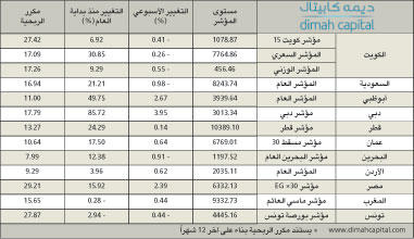 أكد تقرير شركة ديمه كابيتال الاسبوعي أن مؤشر دبي المالي كان أكبر الرابحين خلال الأسبوع الماضي، مقارنة بأسواق المال الأخرى في دول مجلس التعاون الخليجي بارتفاعه بنسبة 3.95%، كما ارتفع مؤشر سوق أبوظبي بنسبة 2.67%، وسط حالة التفاؤل التي تسود أسواق الإمارات والنمو المتوقع بعد فوز دبي بحق استضافة معرض إكسبو 2020، وكان مؤشر السوق السعودي الاكثر تراجعا بين أسواق دول مجلس التعاون بانخفاضه بنسبة 0.98%، وفي ما يلي التفاصيل:وطغى خلال الأسبوع الماضي خبر إعلان فوز دبي بحق استضافة معرض إكسبو 2020 على كل الاخبار الأخرى، لاسيما ان التوقعات تشير إلى أن حجم الإنفاق السنوي للإمارات سيصل إلى 18 مليار دولار حتى موعد إقامة الإكسبو، الأمر الذي من شأنه أن يساهم في زيادة الناتج القومي الإجمالي لدول مجلس التعاون بشكل عام ولإمارة دبي بشكل خاص.