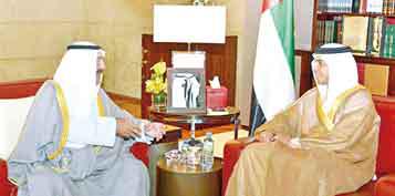 اطمأن وزير شؤون الديوان الأميري الشيخ ناصر صباح الأحمد أمس على صحة رئيس دولة الإمارات الشيخ خليفة بن زايد آل نهيان خلال زيارة قصيرة قام بها للعاصمة الإماراتية أبوظبي.وقال الشيخ ناصر في تصريح لـ"كونا" انه نقل خلال اللقاء تحيات سمو أمير البلاد الشيخ صباح الاحمد للشيخ خليفة وتمنياته له بالشفاء العاجل، اضافة إلى تحيات وأمنيات كل من سمو ولي العهد الشيخ نواف الأحمد ورئيس مجلس الوزراء سمو الشيخ جابر المبارك.