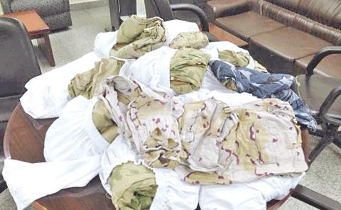 تمكن رجال جمارك ميناء الشويخ، فريق الجوالة، من التصدي لمحاولة تهريب كمية كبيرة من الملابس العسكرية المختلفة والتي كانت تحمل أسماء وشعارات وأوسمة، كانت مخبأة بداخل مجموعة من الملابس بطريقة احترافية.