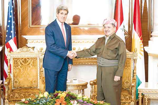 استكمل وزير الخارجية الأميركي جون كيري اجتماعاته بالقادة العراقيين، فالتقى أمس رئيس إقليم كردستان العراق مسعود البرزاني، وحثه على المساهمة في إنقاذ العراق، معبراً عن "تفاؤل حذر" بقدرة العراقيين على تشكيل حكومة جديدة تمنح غطاءً سياسياً لأي عملية عسكرية ضد تنظيم "داعش"، الذي بات يسيطر على مساحات واسعة في شمال العراق وغربه.وقال كيري بعد لقائه البرزاني في أربيل إن "تحدي تشكيل الحكومة هو التحدي الرئيسي الذي نواجهه". وأكد الوزير الأميركي أنه تلقى "إشارات" من الزعماء العراقيين بأن "هناك قدرة على تشكيل حكومة جديدة"، إلا أنه قلل من أهمية هذه الإشارات، قائلاً لشبكة "سي أن أن" الأميركية: "الكلام رخيص، ولا آخذ أي شيء أسمعه إلى البنك، أنا أسمع أموراً تشير إلى أنهم إذا تابعوها فهناك قدرة للوصول إلى تشكيل حكومة جديدة قد تكون موحدة، وتنعكس بشكل كبير على تحقيق النجاح في اجتياز هذه الأزمة".